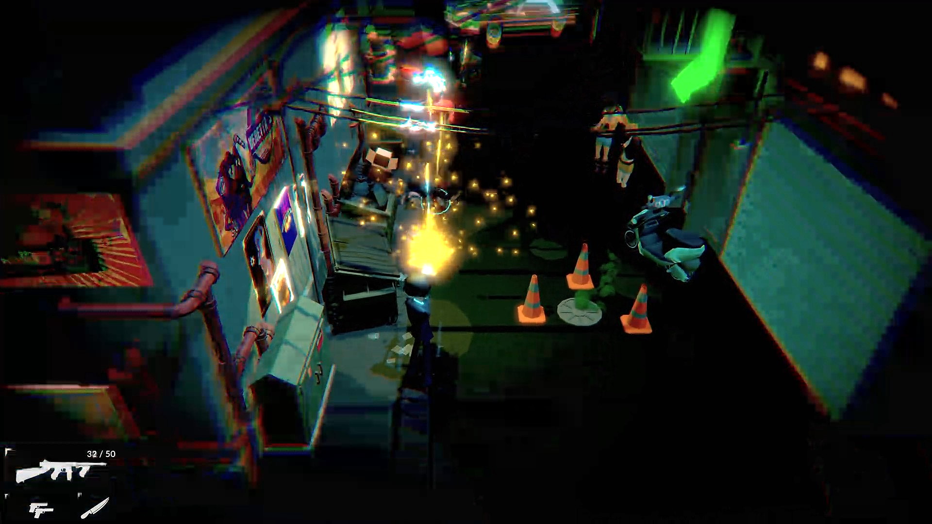 • 路地を右折した先、ヘビーマシンガンを持った敵1人を含む、2人の敵が配置されている