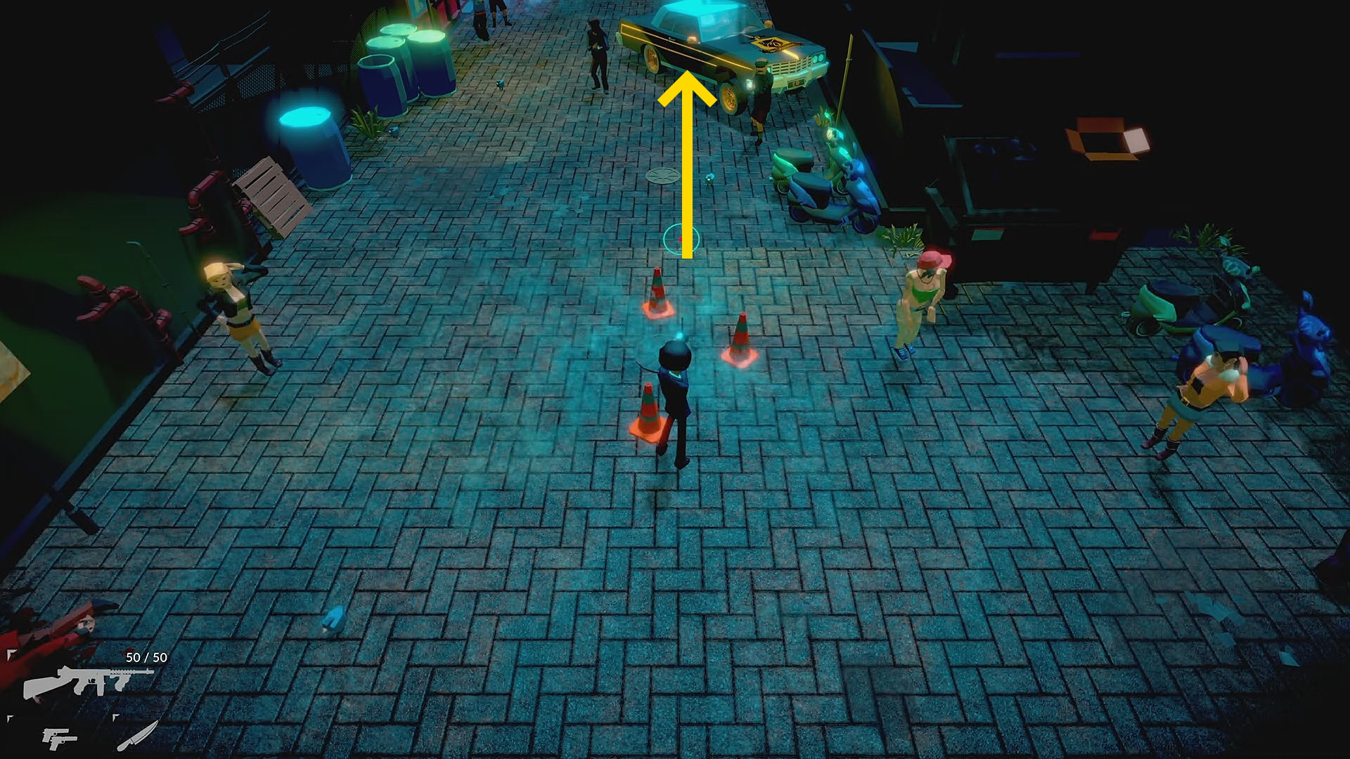 - 画面上、ロードコーンが3個置いてある先に4人の敵