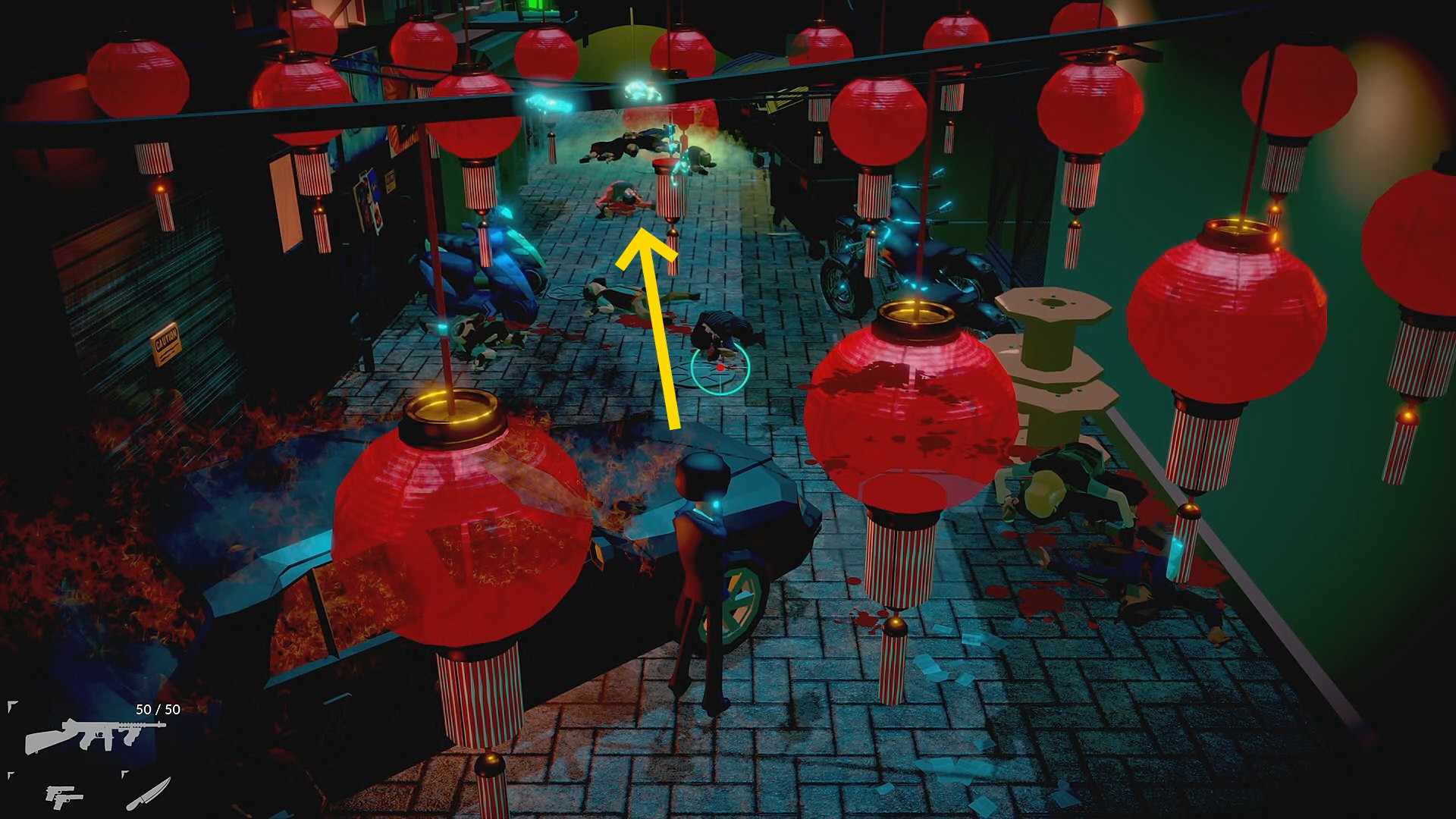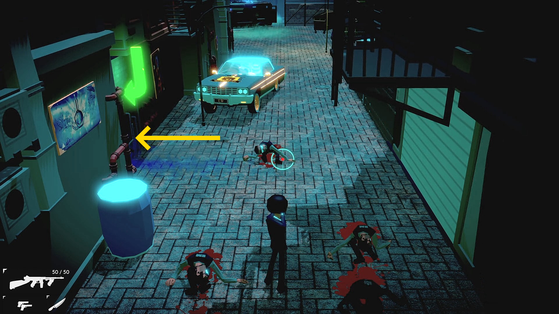 - これまでと同様に対処しつつ、車の向こうにいた敵もこちらに向かってくるので、さらに路地を戻り、爆破した車のところで迎撃