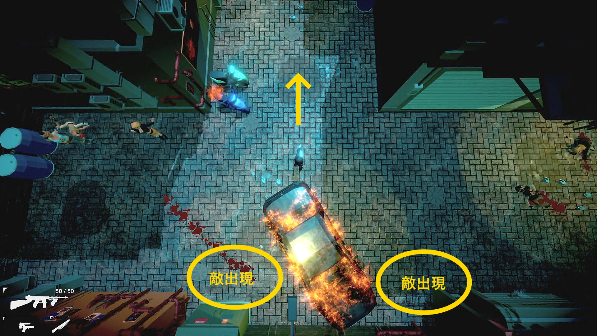 - 斜めに停まった車のところに戻り、画面上に進もうとすると背後の車の両脇に合計4人の敵が出現