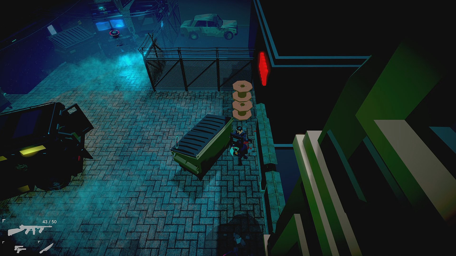 - 斜めに停まった車の向こうに敵が1人見え、そっちに近づくと背後の曲がり角に2人の敵が出現