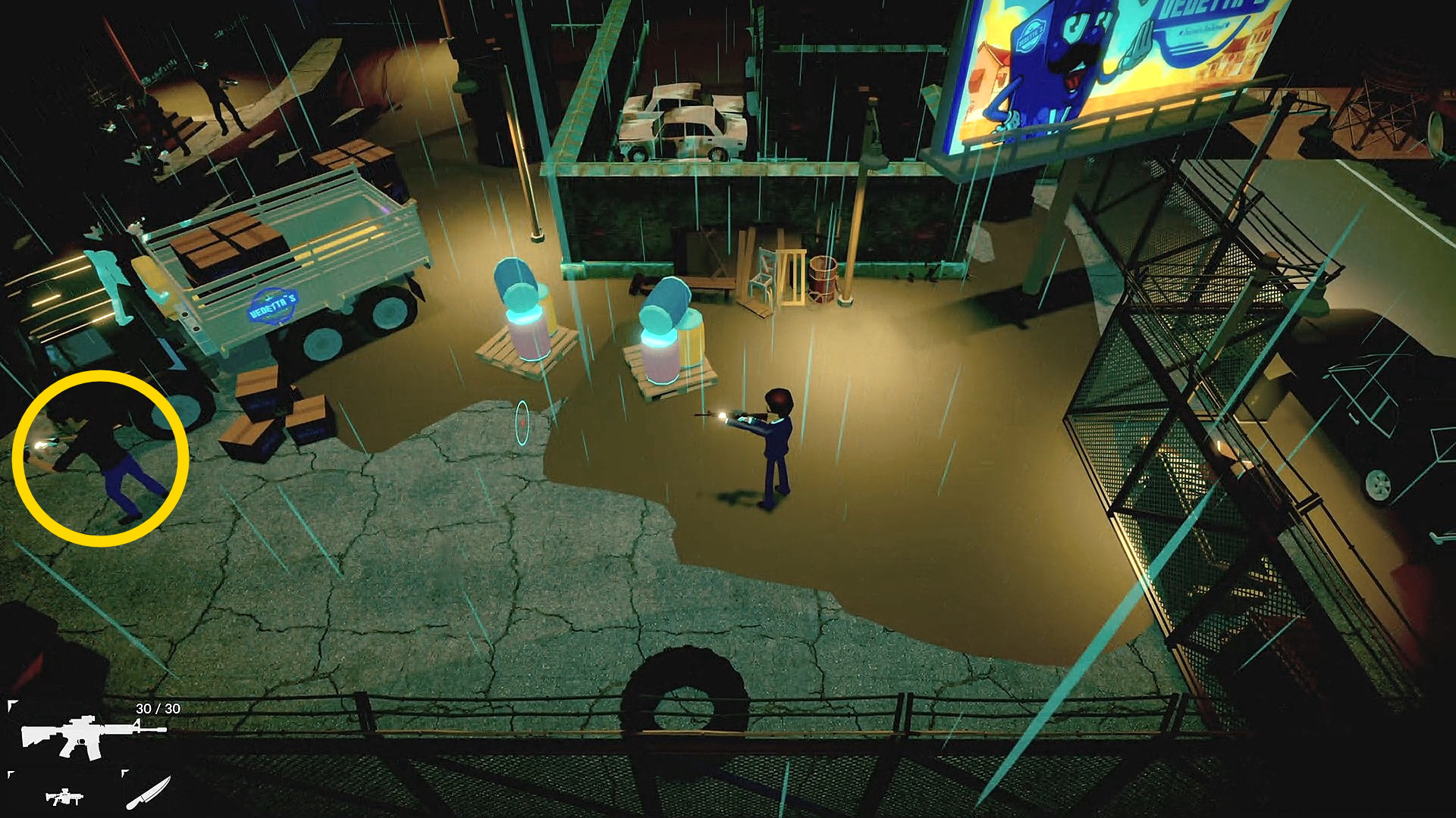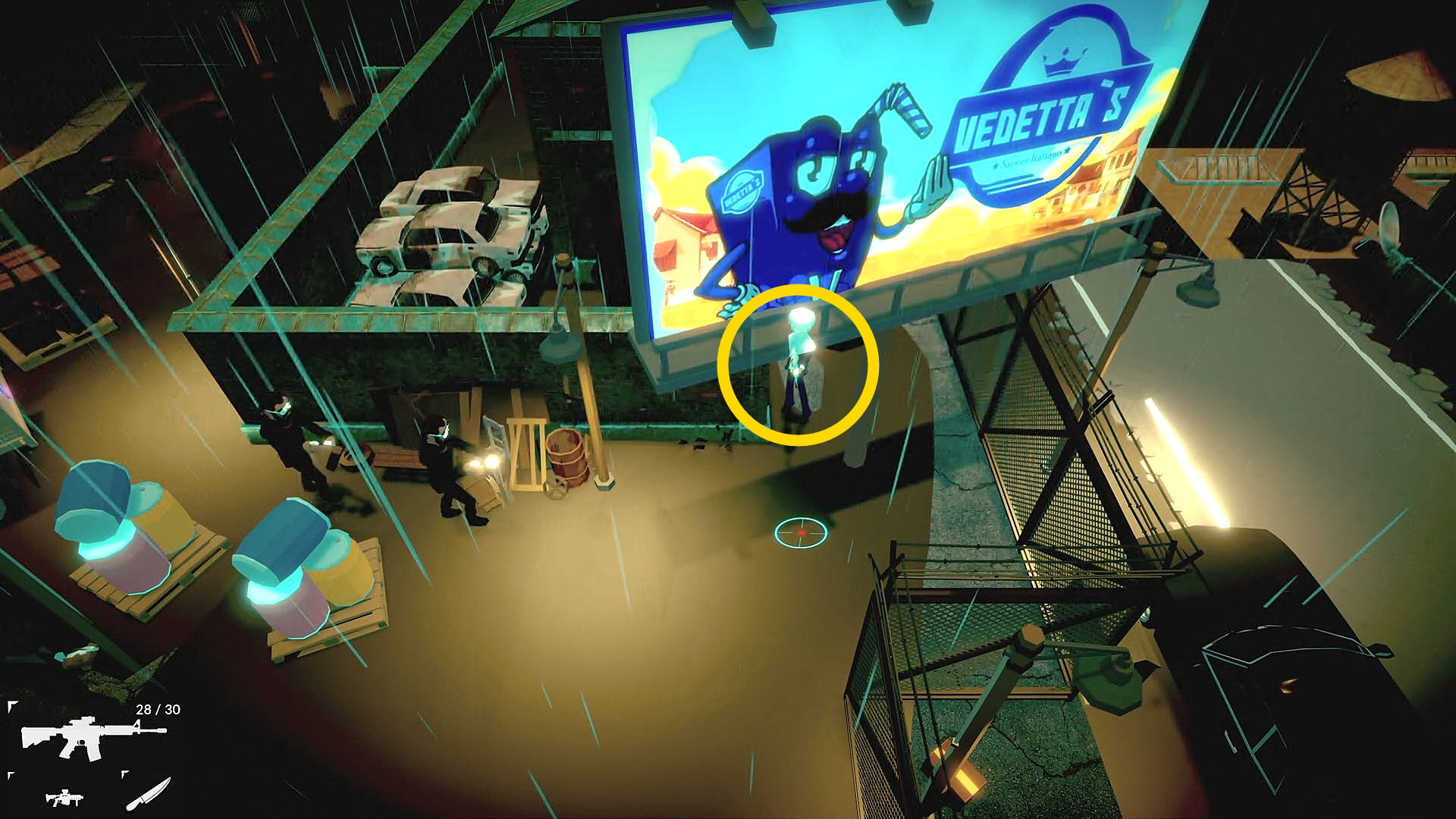 • 工場に入り、階段を登る前に左下のドアから外に出て、右に進むと敵が1人立っている