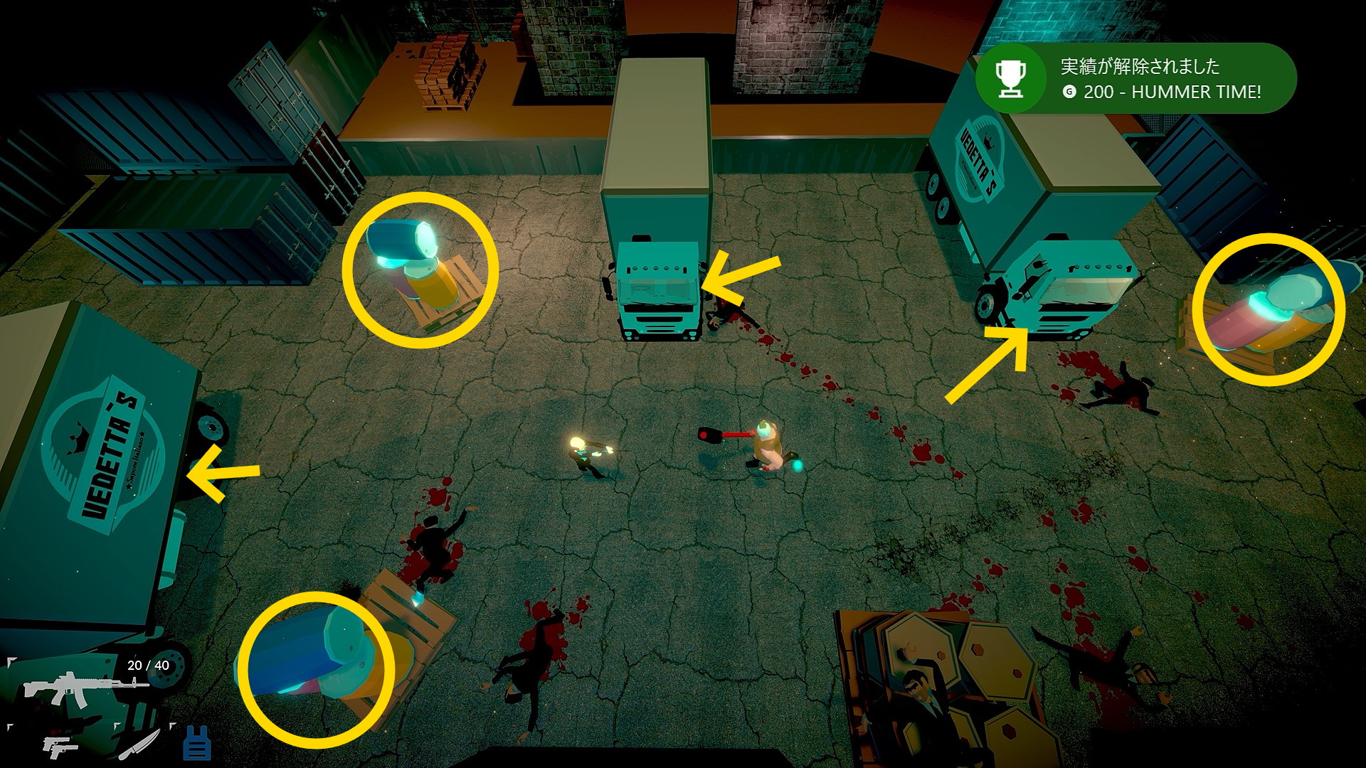 • このとき、周囲に設置された爆発する樽やトラックを撃ち、爆発ダメージをボスに与えれば 実績「HUMMER TIME!」 解除