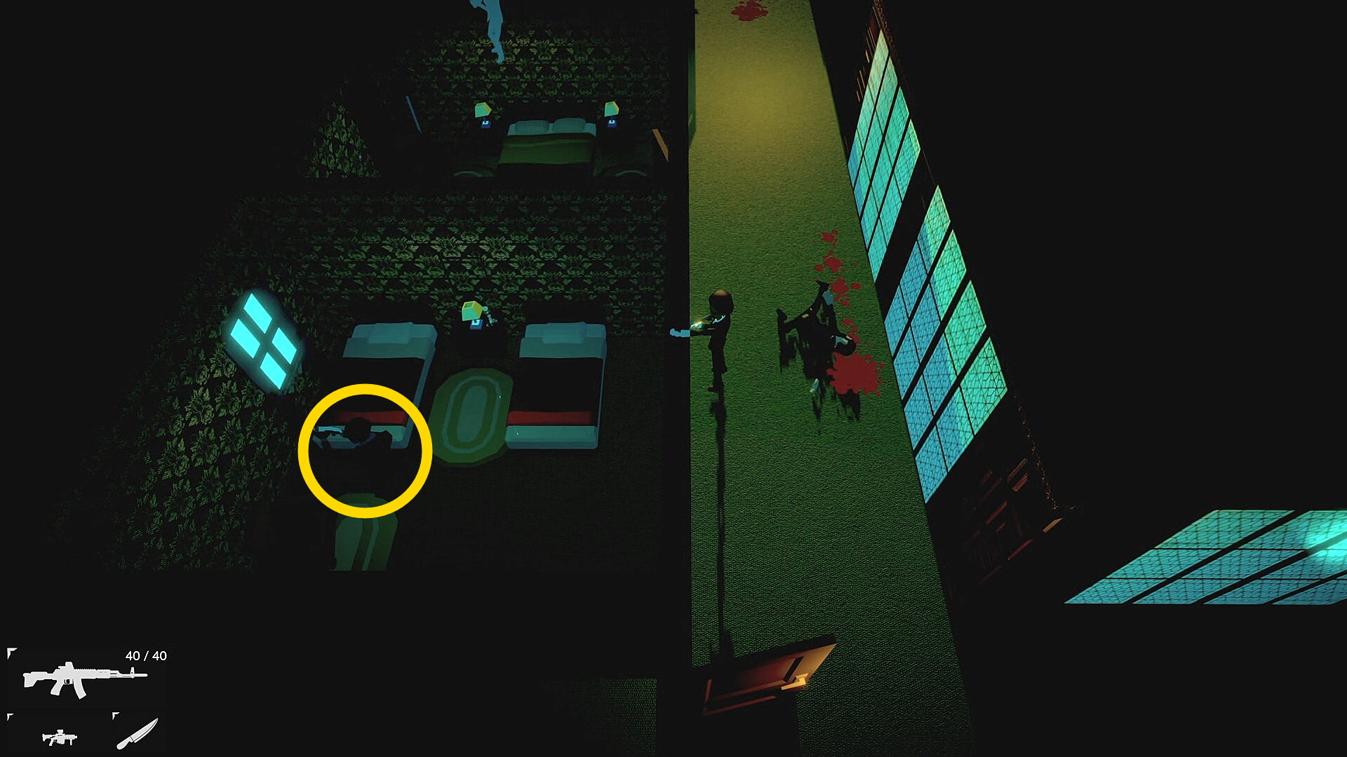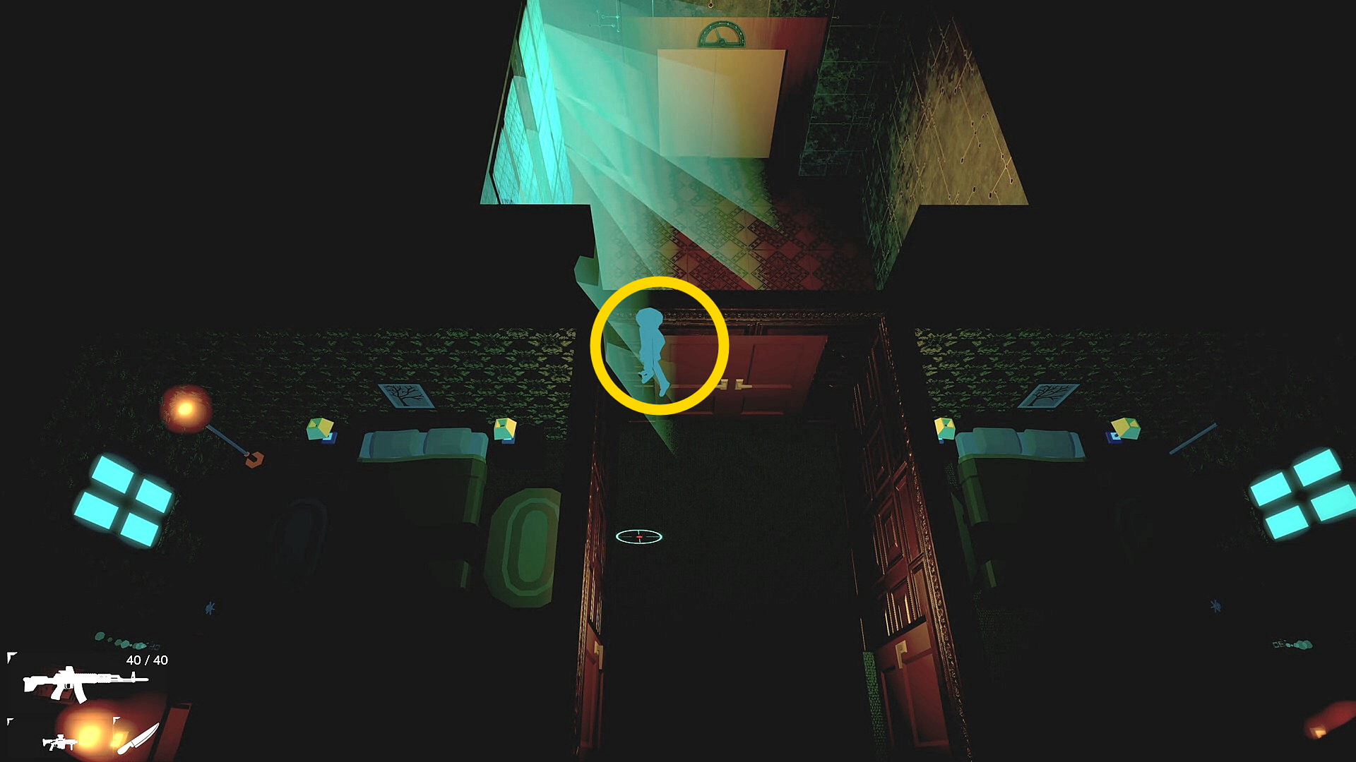 - ドアを開けて右の部屋に入り、壁抜きキルで下の部屋の敵を始末