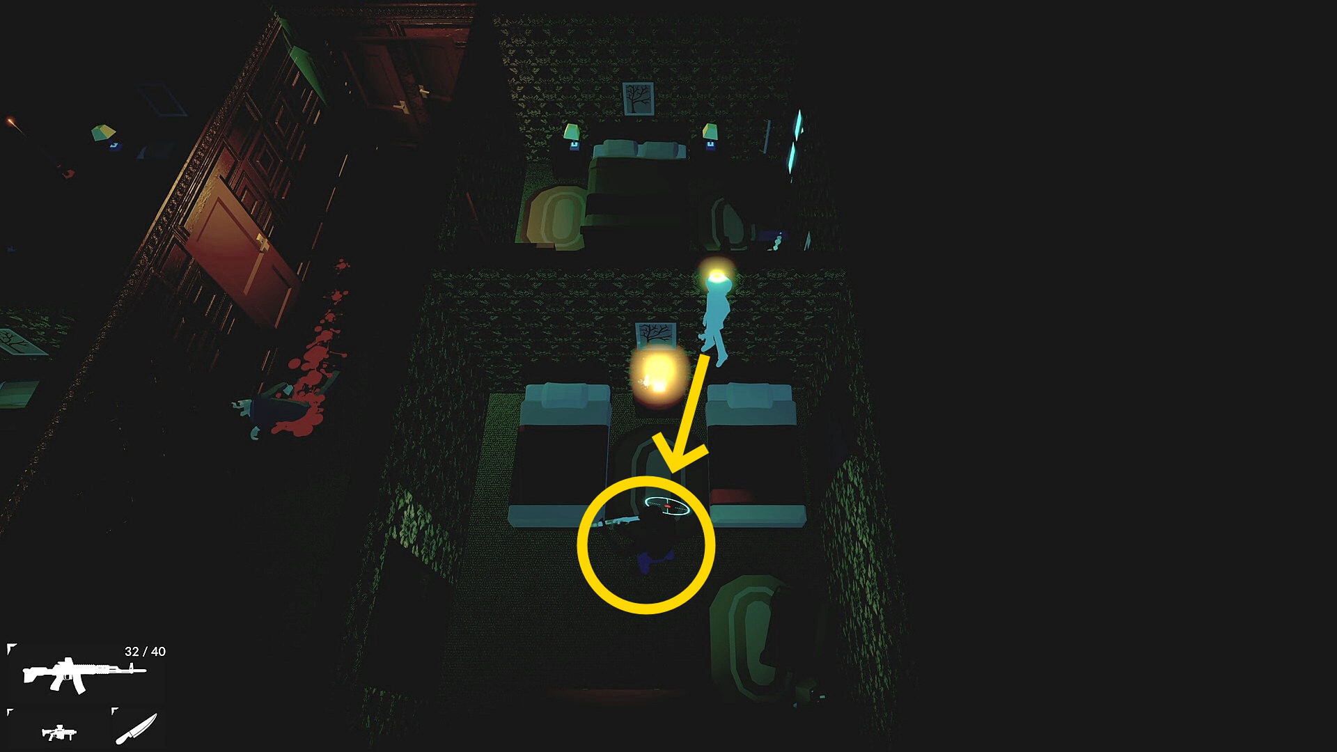 - 暗くて見にくいが応接セットがあり、下画像の○印のところに行くと敵の声がするので、急いで基本の場所に戻る