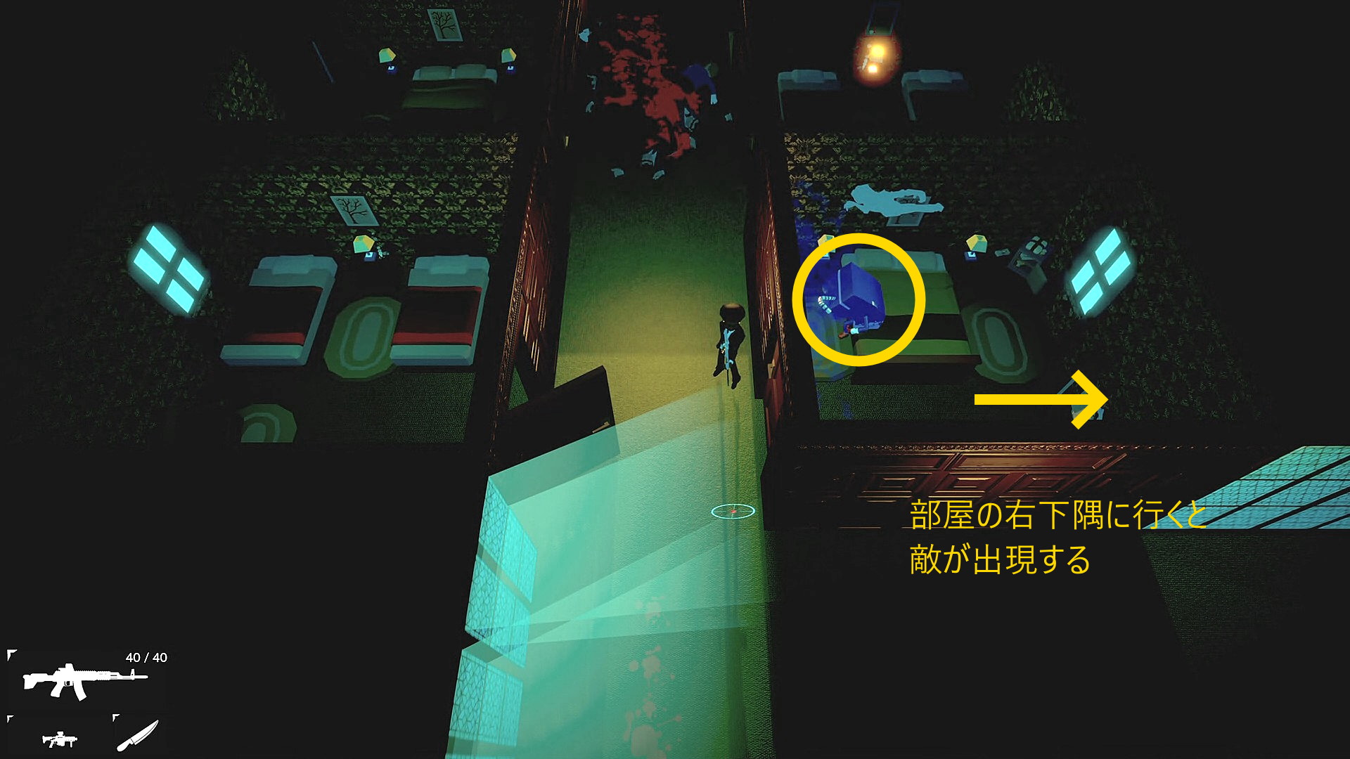 - 部屋の右下隅に移動すると敵の声が聞こえるので、基本の場所に戻る