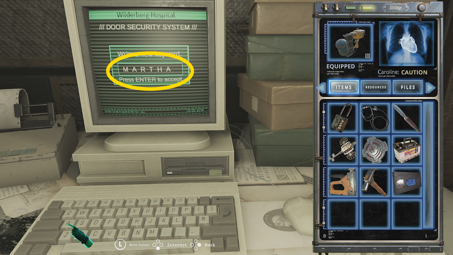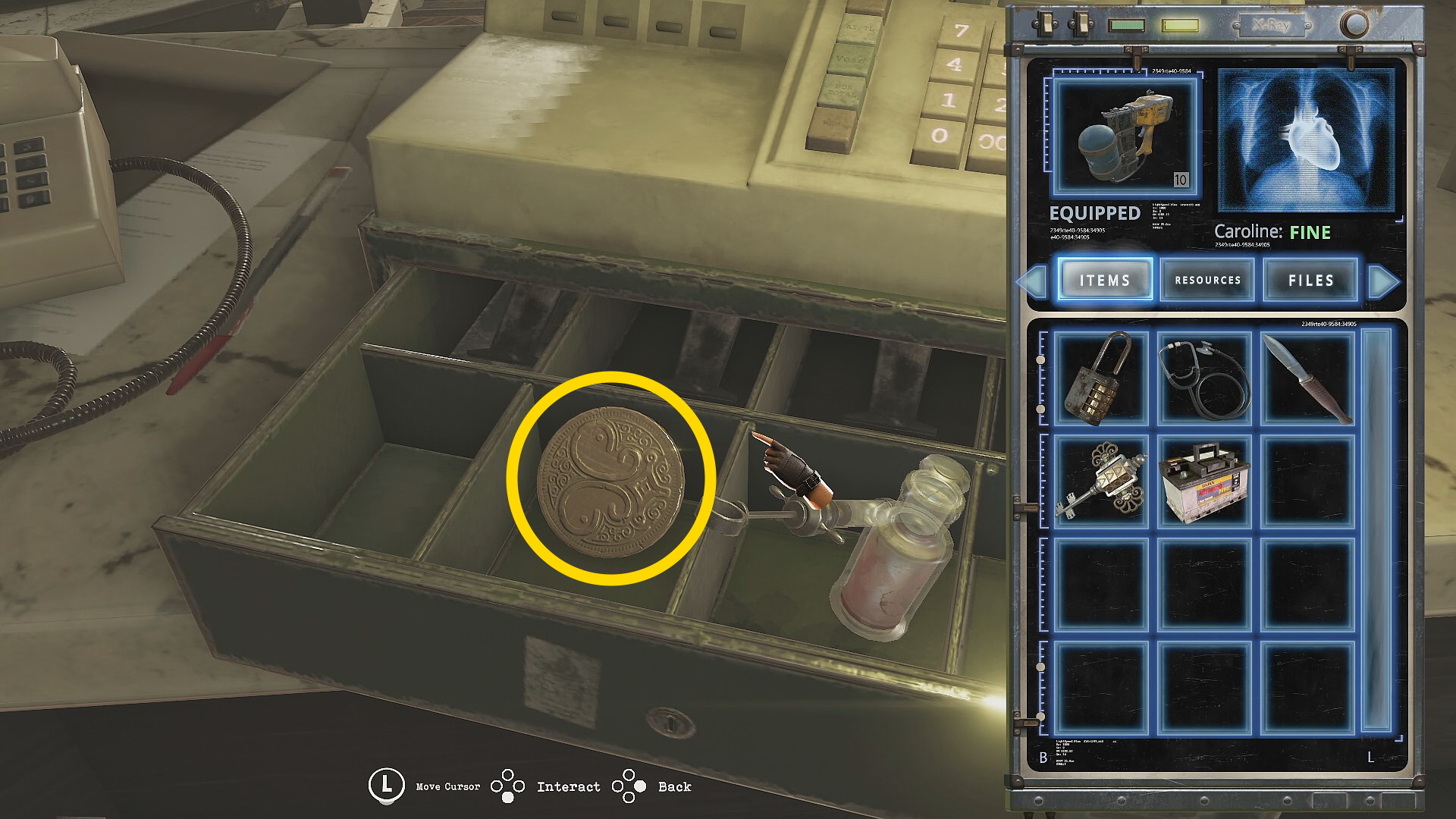 - 左に進み、レジスターに「0414」と入力するとキャッシュドロアーが開き、 Coin と モルヒネ