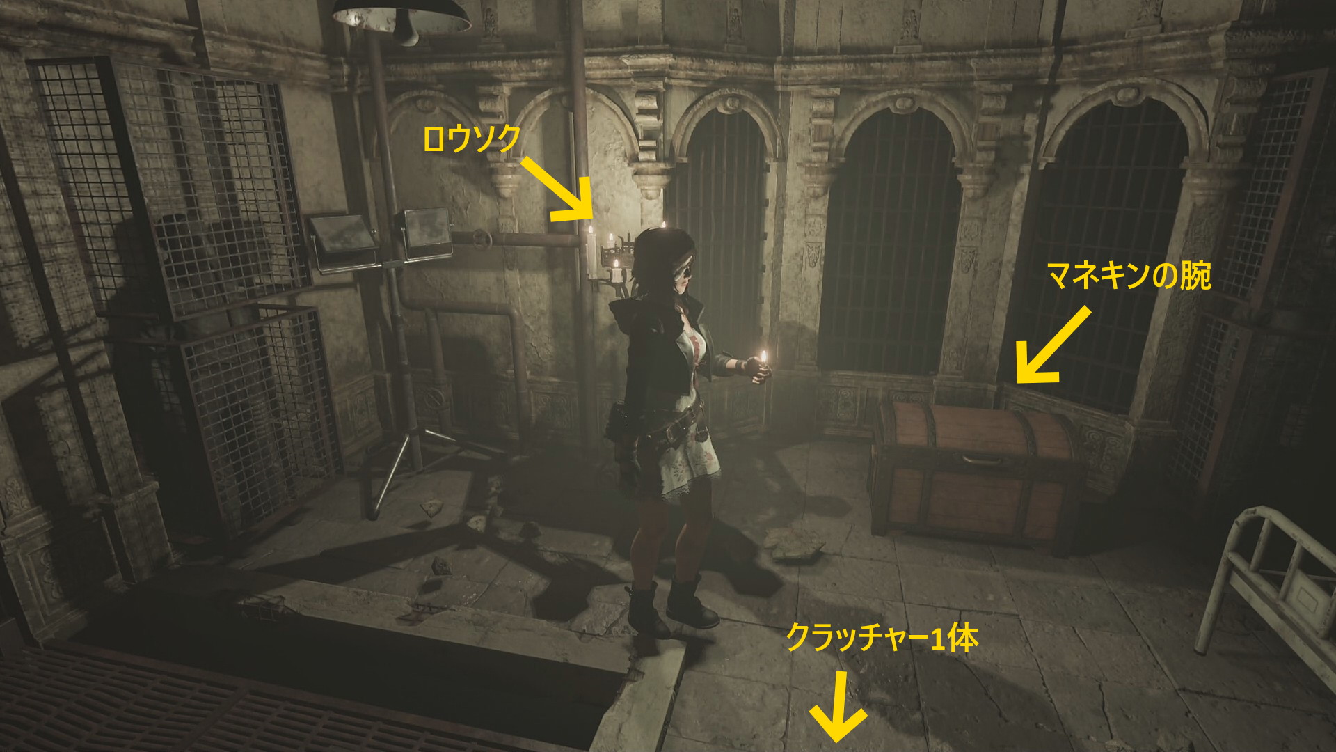 - 着火したロウソクの右側の木箱を開けて Mannequin Arm(以降、マネキンの腕) を回収