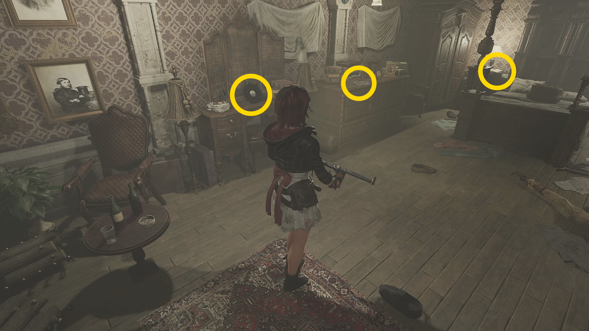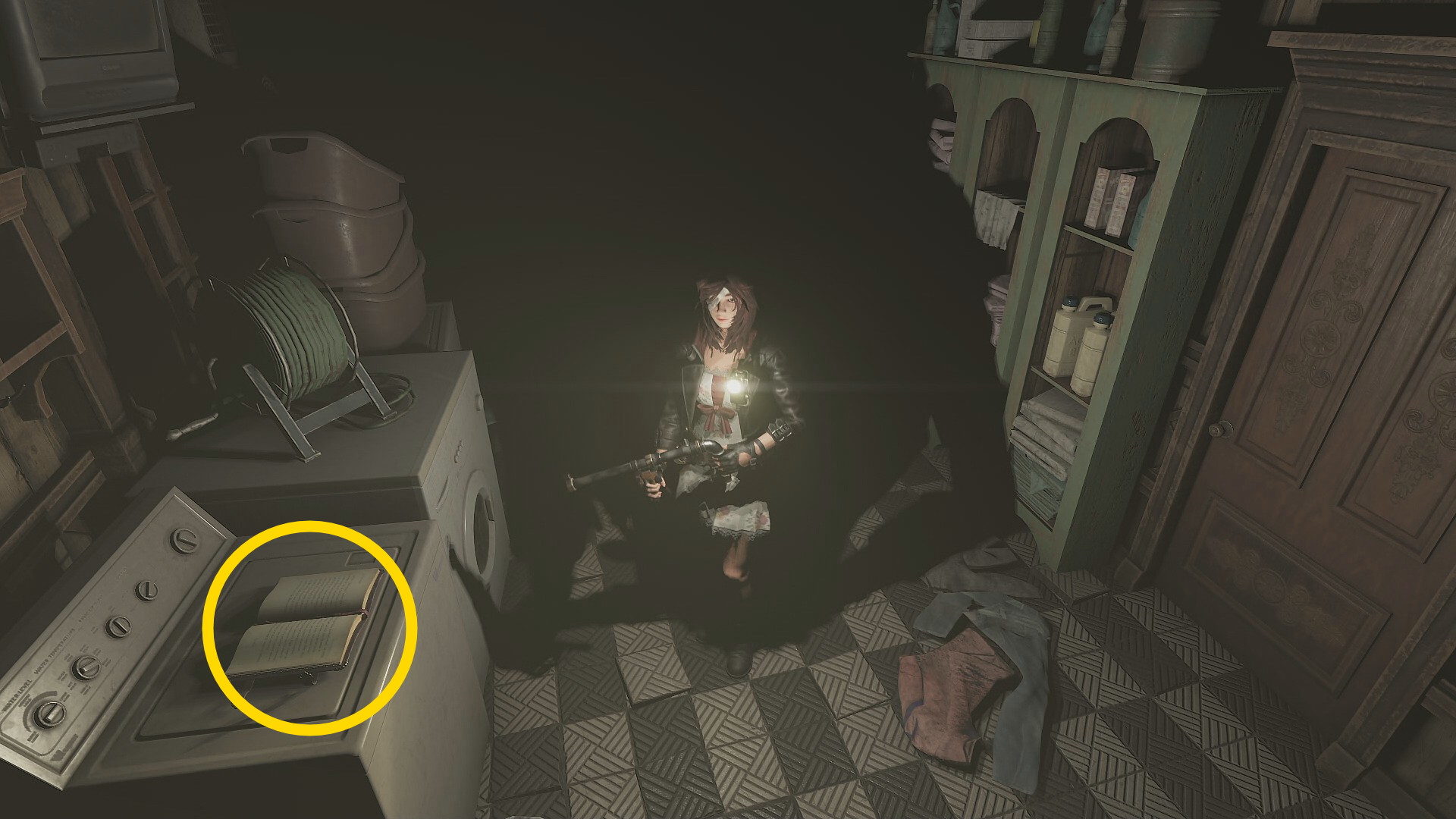 - スピッターをキル後、部屋の左に Vinyl(以降、レコード)、セーブ用テープ、ベッド脇のナイトテーブルに マリアの日記(7/8)