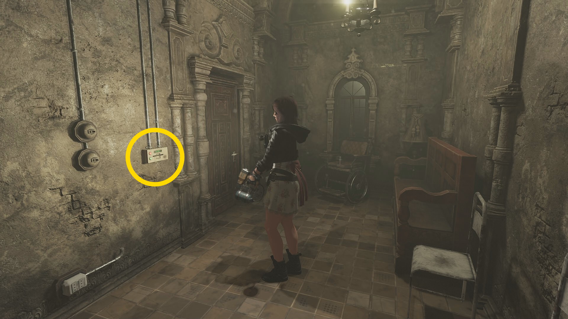 - Dining Room Hallway 側のドア近くにリフトがあり、そこに充電済みバッテリーを入れて上階へ