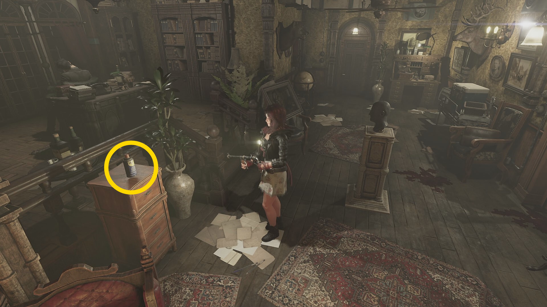 - 部屋のど真ん中に顔像があり、その左側のキャビネットの上に WE-40(以降、潤滑スプレー)