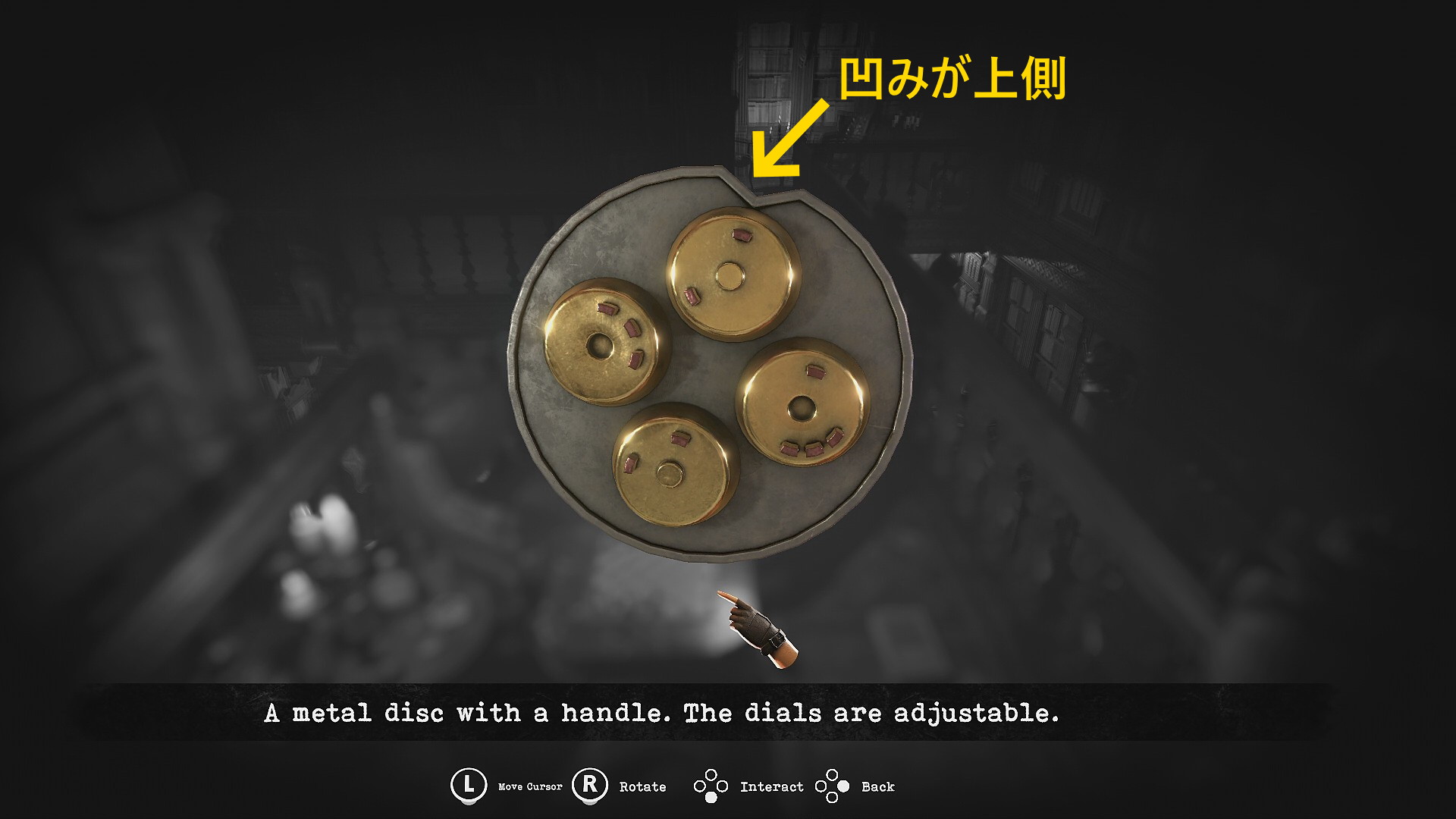- 画面奥、右側の通路に入ると突き当りにパズルのヒント