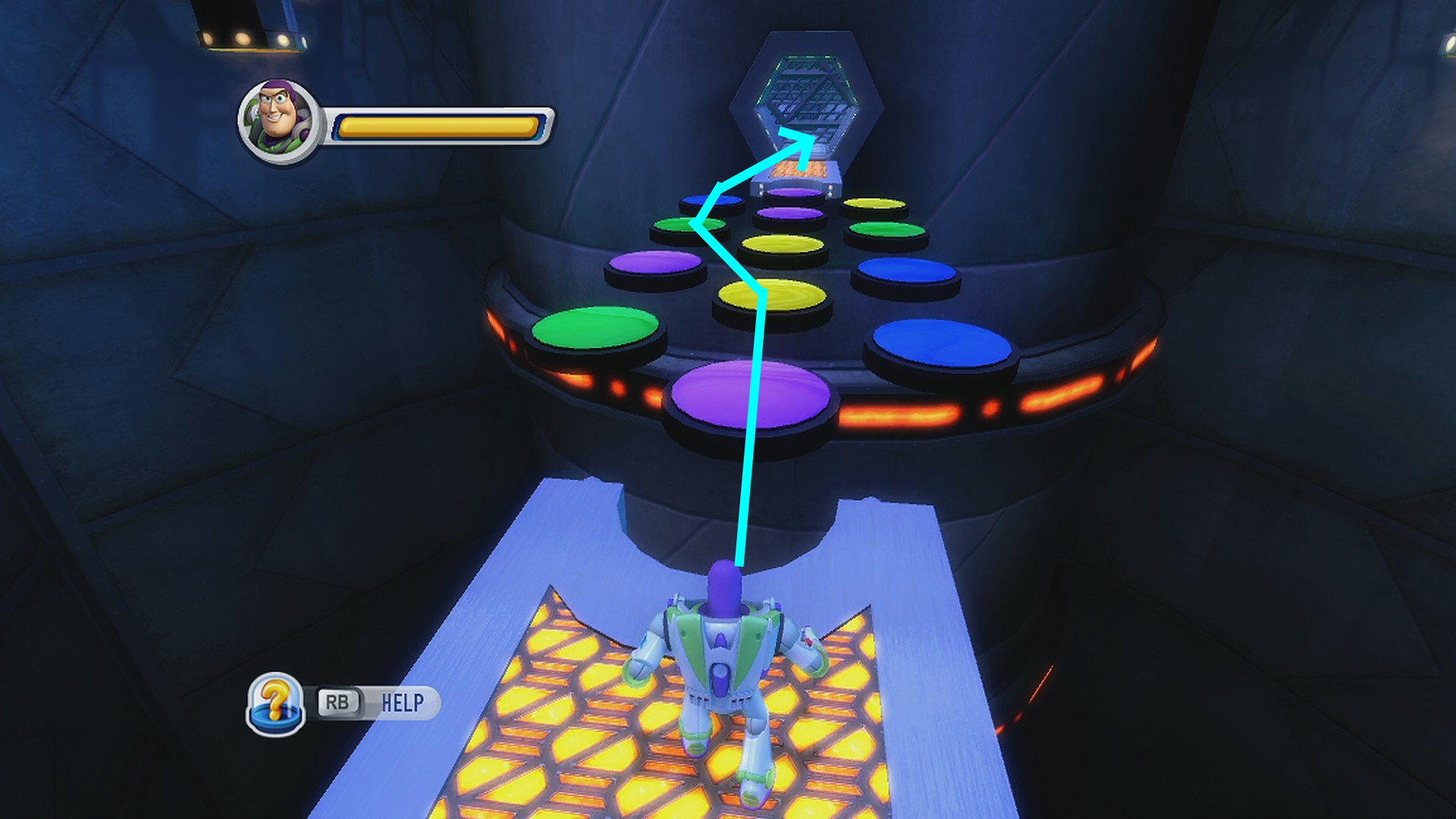 - 紫 ⇒ 黄 ⇒ 二段ジャンプして緑 ⇒ 青 ⇒ 足場