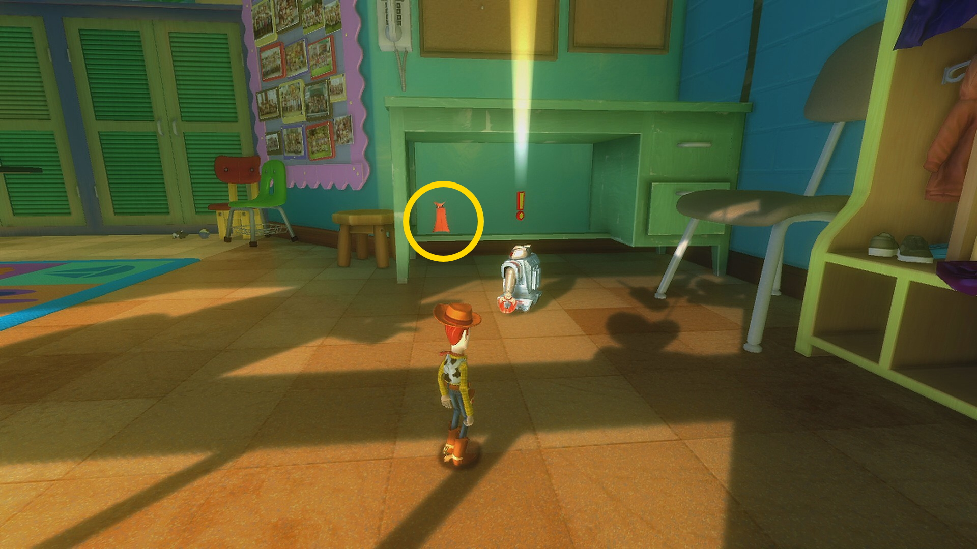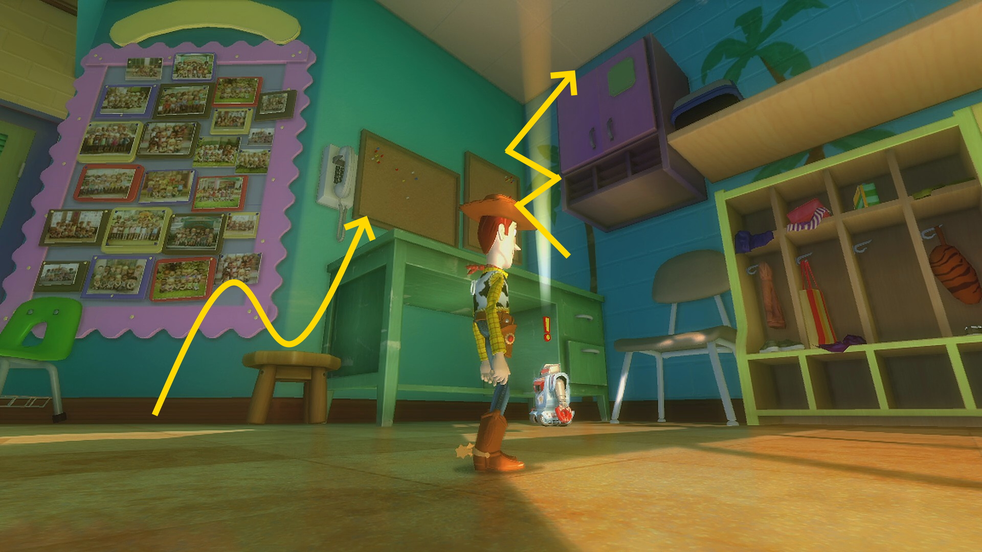 - テーブルとロッカーの間を壁ジャンプし、レックス (緑色の恐竜)のところまで上がる