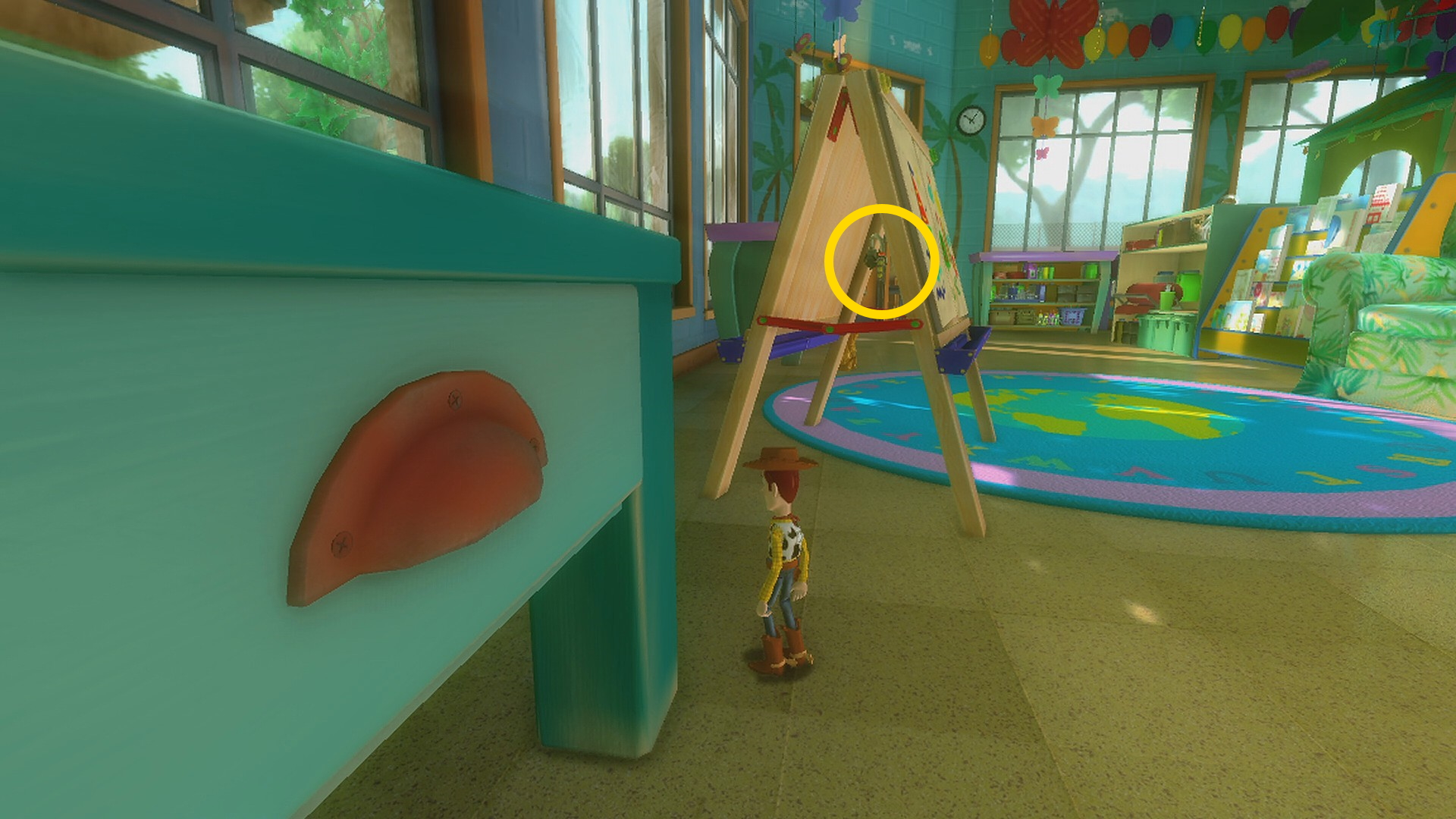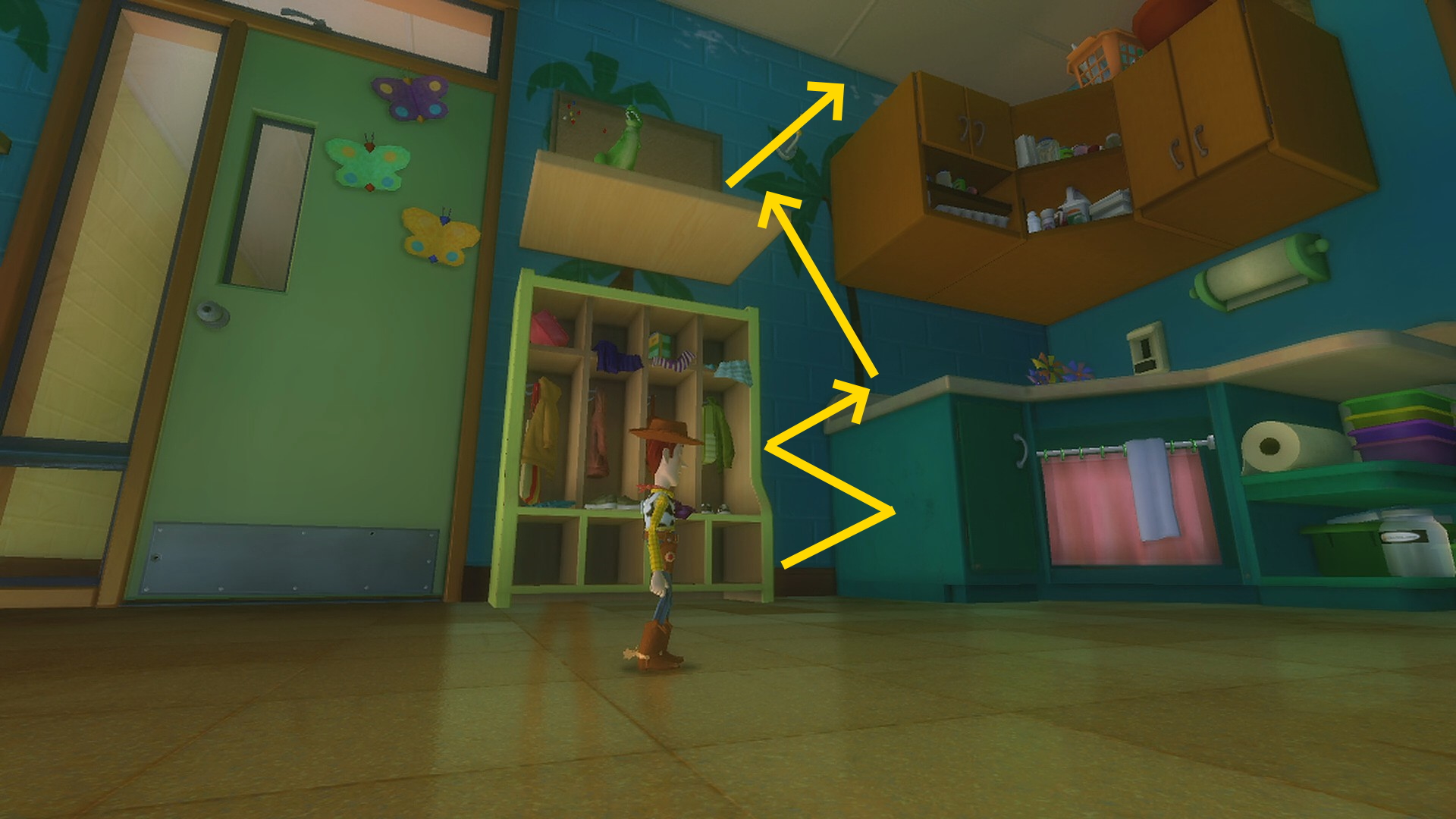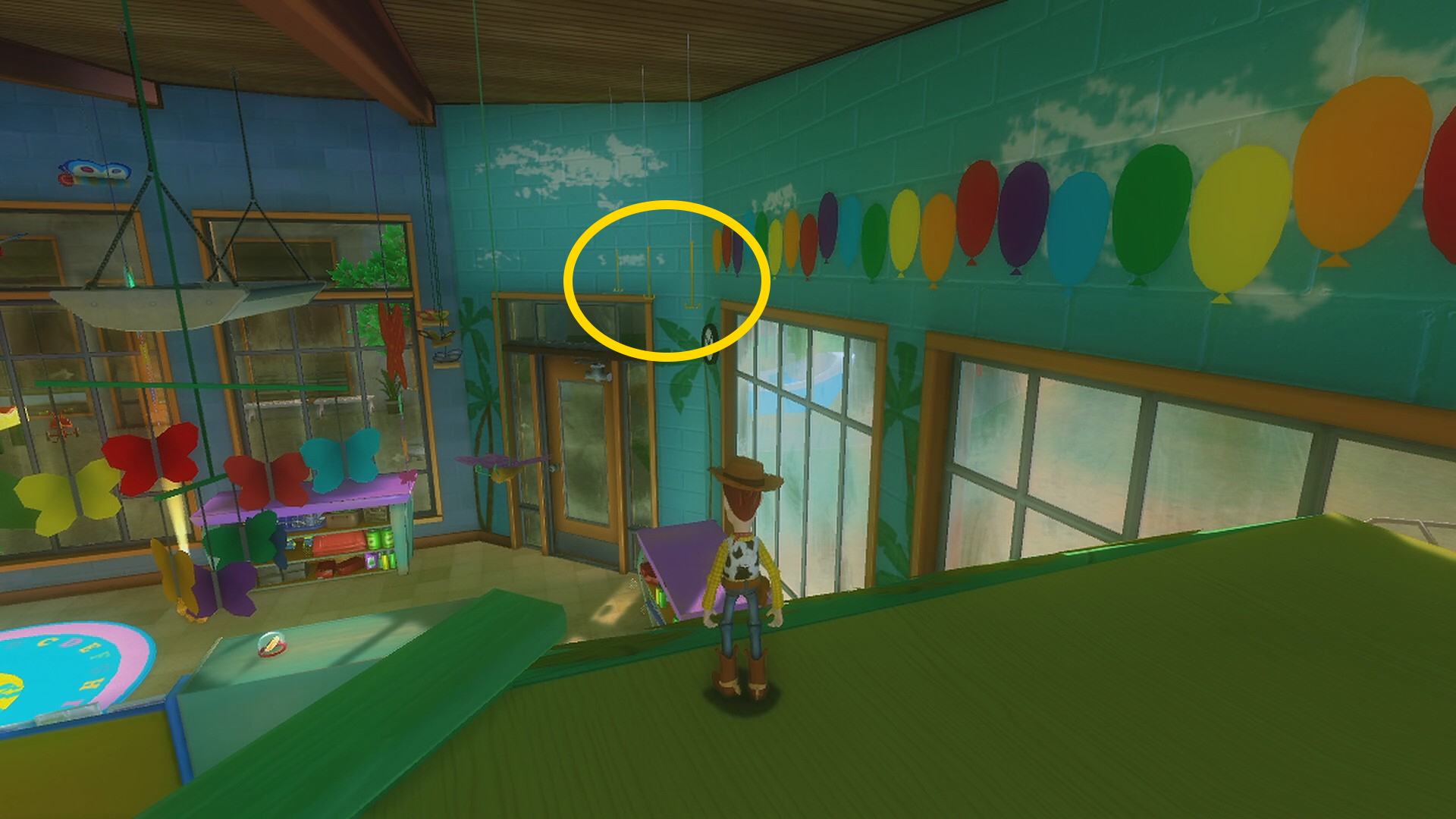 - バズをウッディが持ち上げたら小屋の屋根の方を向く (バズが投げるときのように緑のラインは出ない)