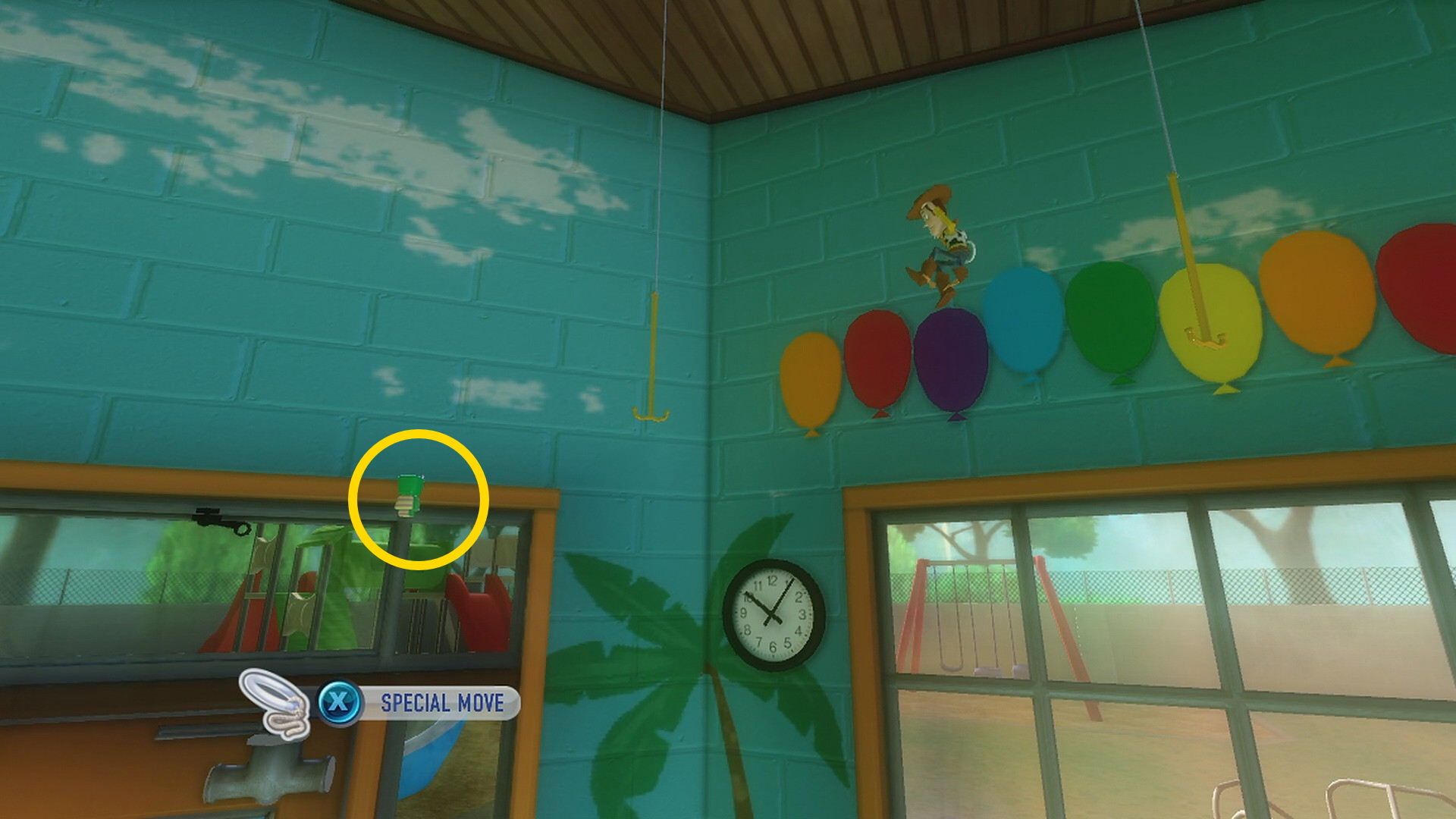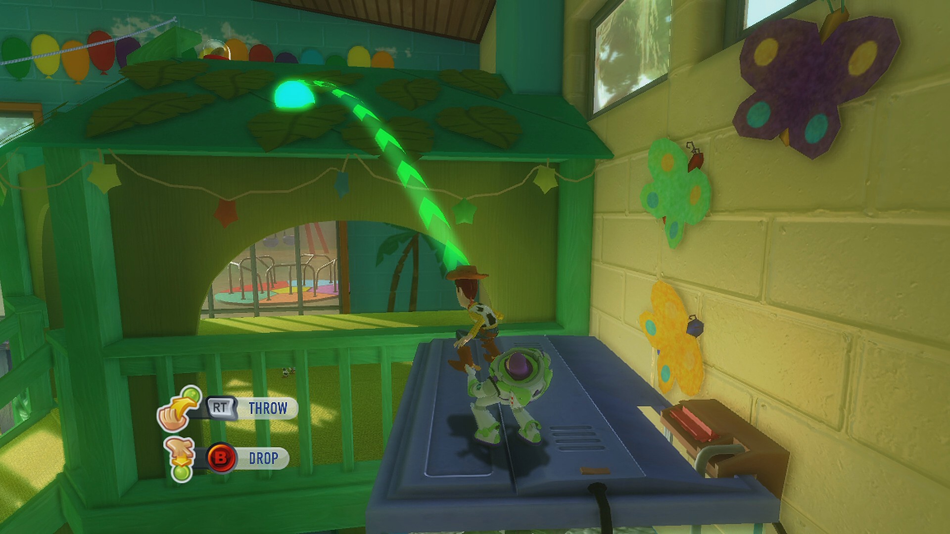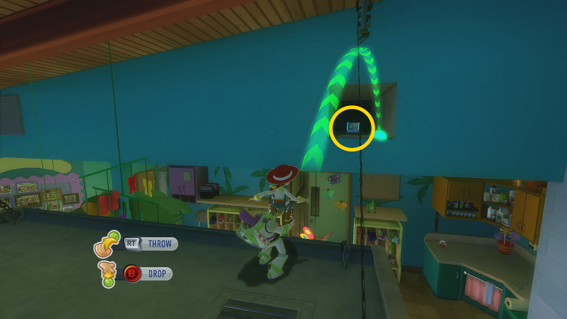 - LB を押してバズにキャラチェンジしたら RT を押すとウッディが投げてくれるので A を押してジャンプすると屋根に届く