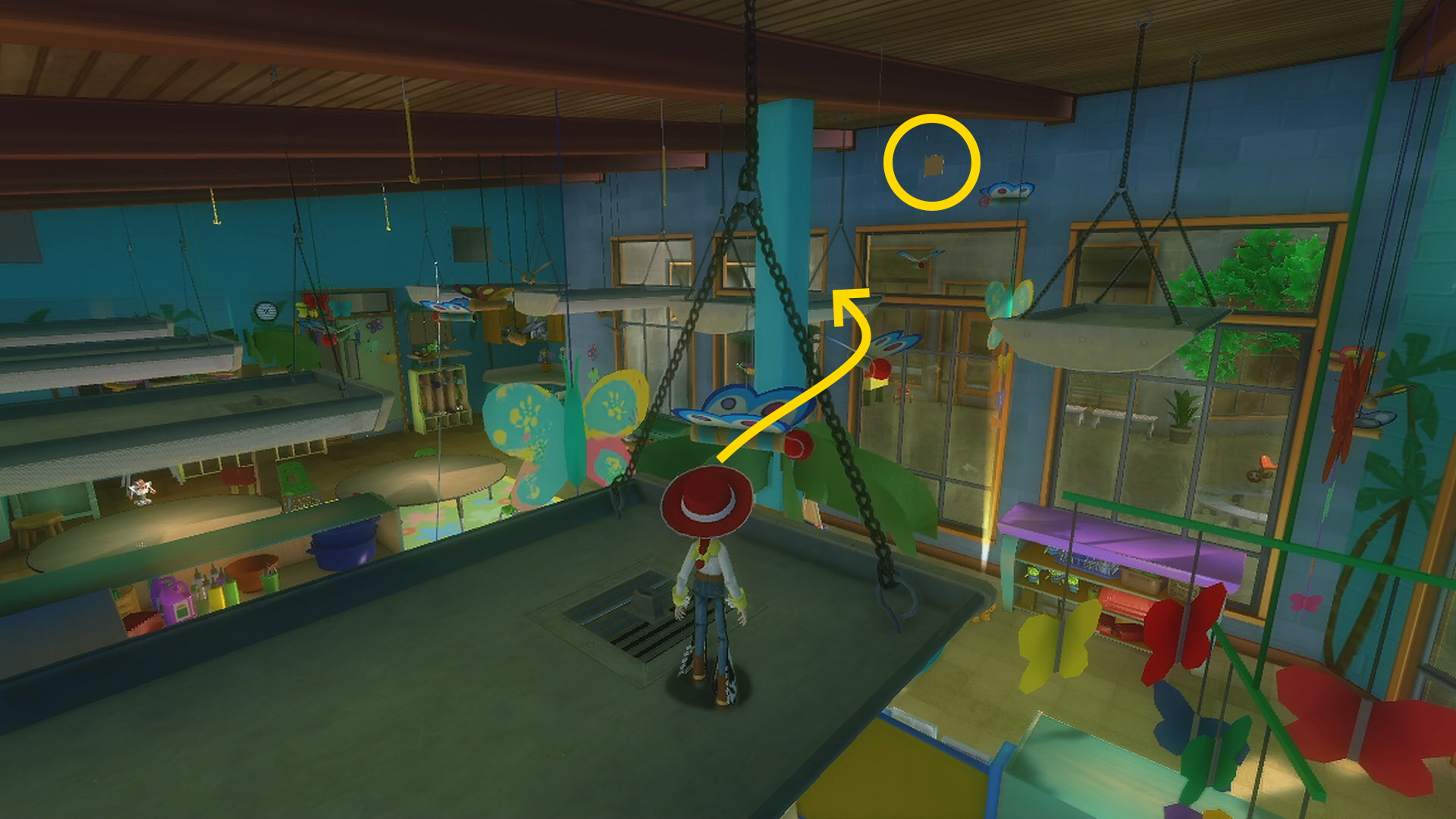 - 小屋の屋根と一番奥の照明器具はロープで結ばれているので、ジェシーとバズはロープを滑走して照明器具に乗る