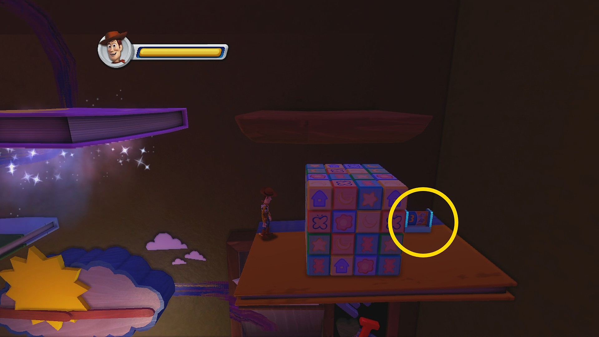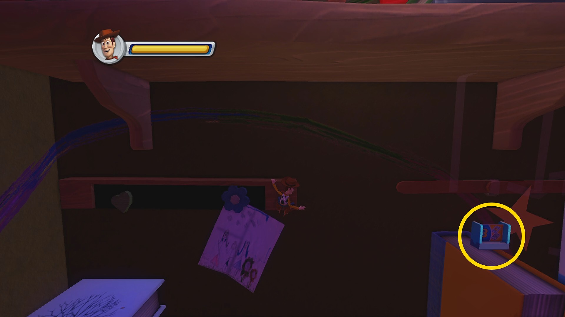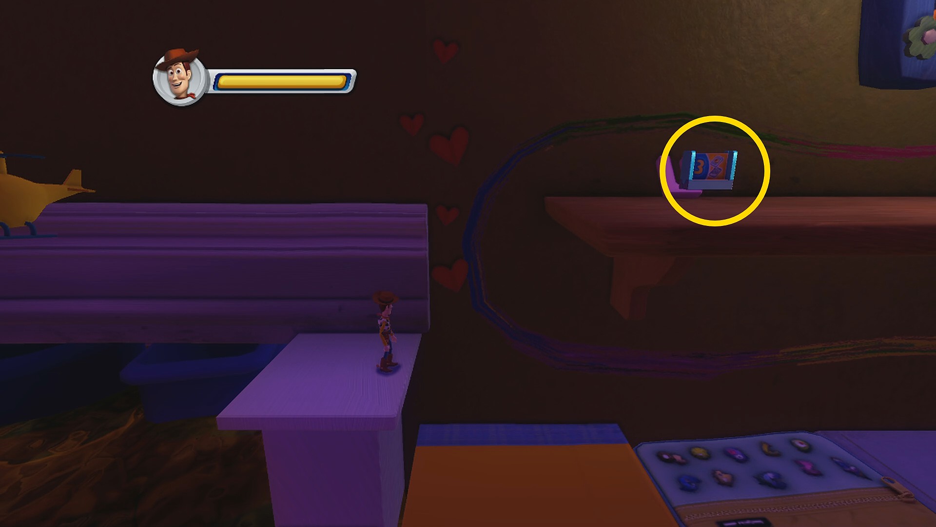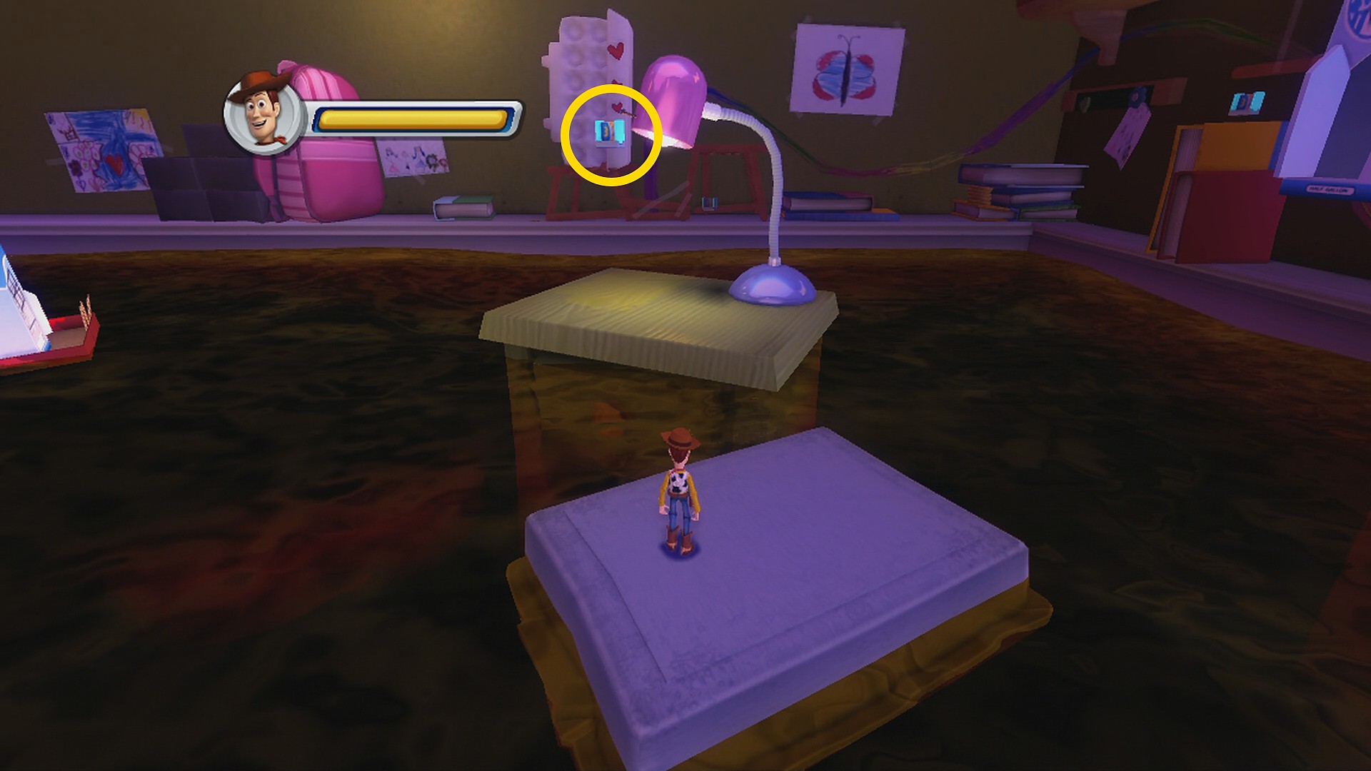 • 上下に動く本に乗って右側の足場にジャンプし、ブロックの裏にある Toys Card 2:Hamm (6/8)