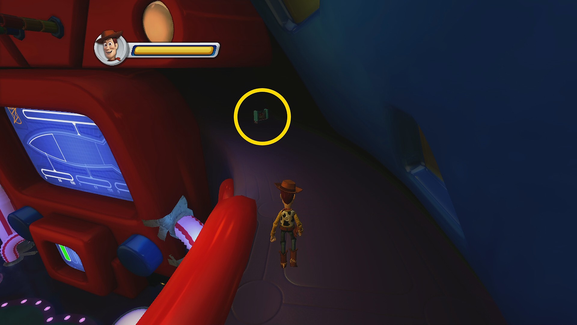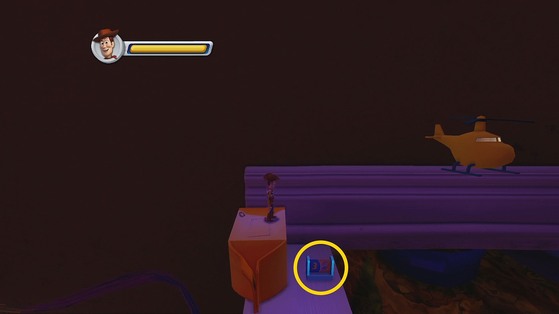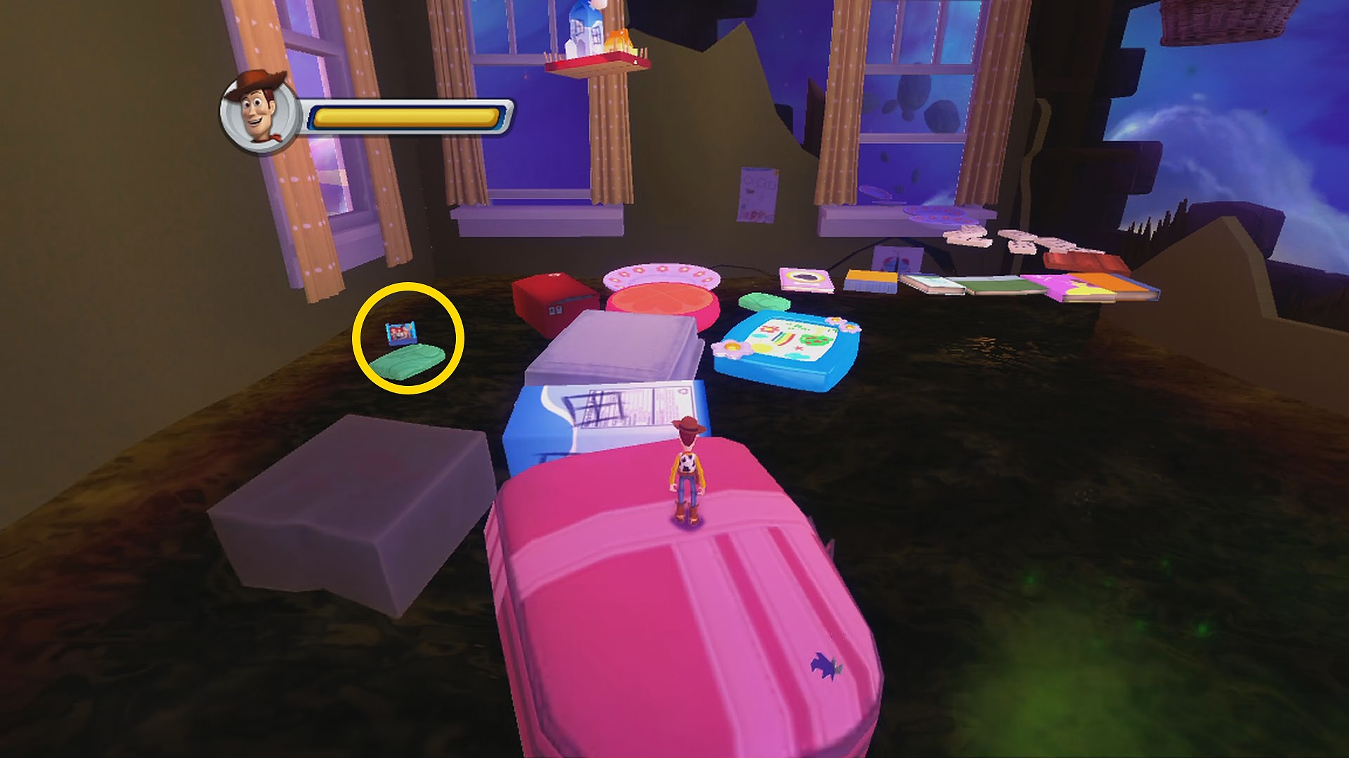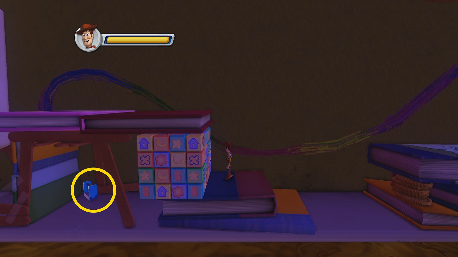 • 上下に動く本に乗って右側の足場にジャンプし、ブロックの裏にある Toys Card 2:Hamm (6/8)