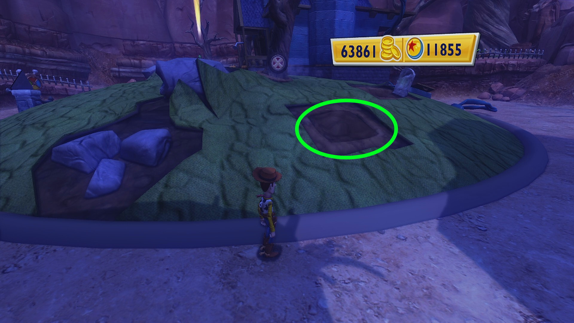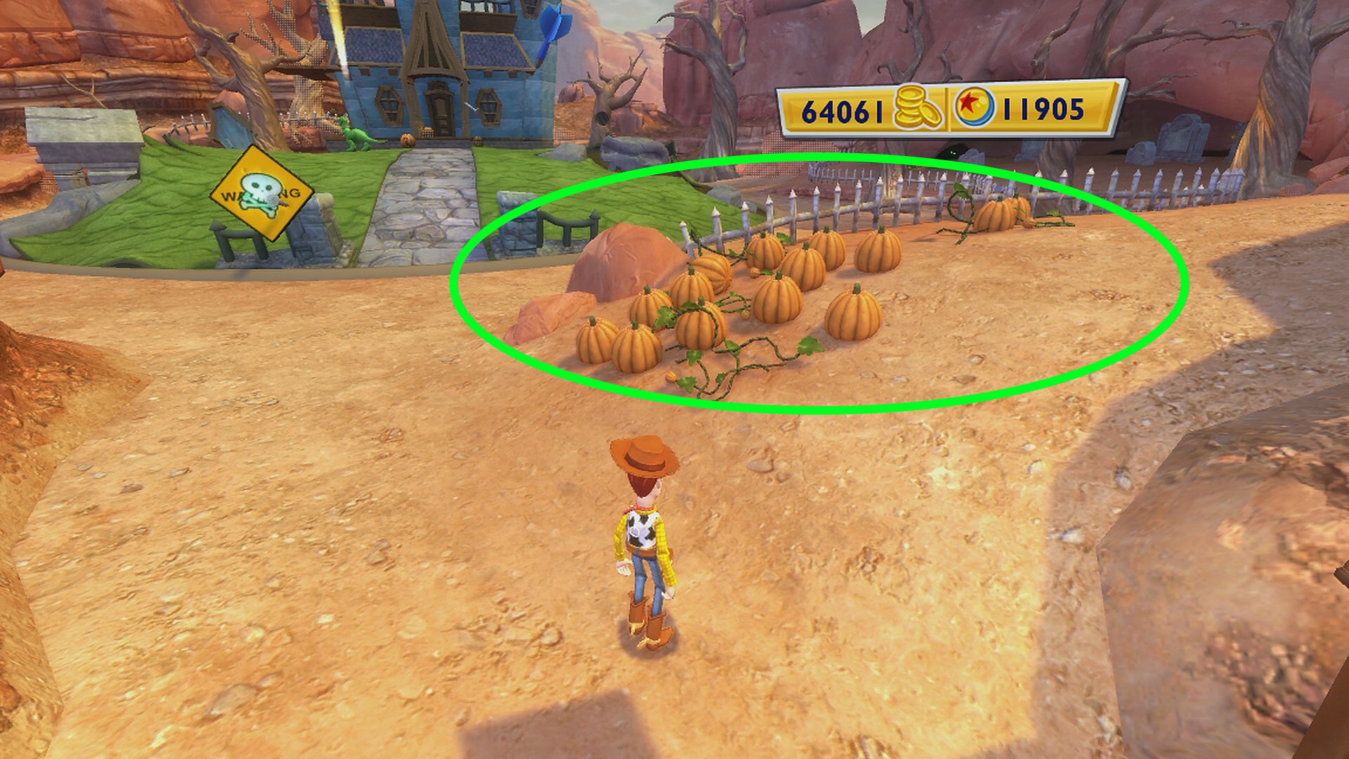 - Slinky’s Ranch の庭 (畑)へ行き、かぼちゃを育てる (もぐらを6匹倒すミニゲームをクリアする)