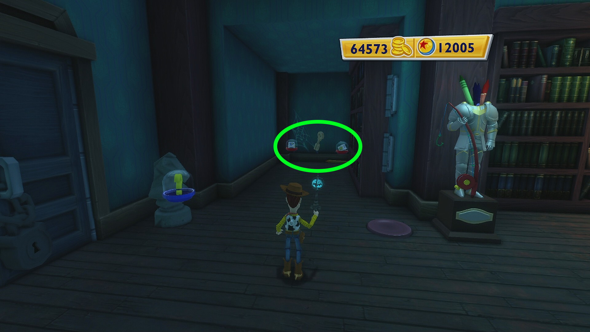 - 首のない騎士像の右側の床にあるボタンを踏むと本棚が動いて Invisible Alien Hat/Haunted Man Hair