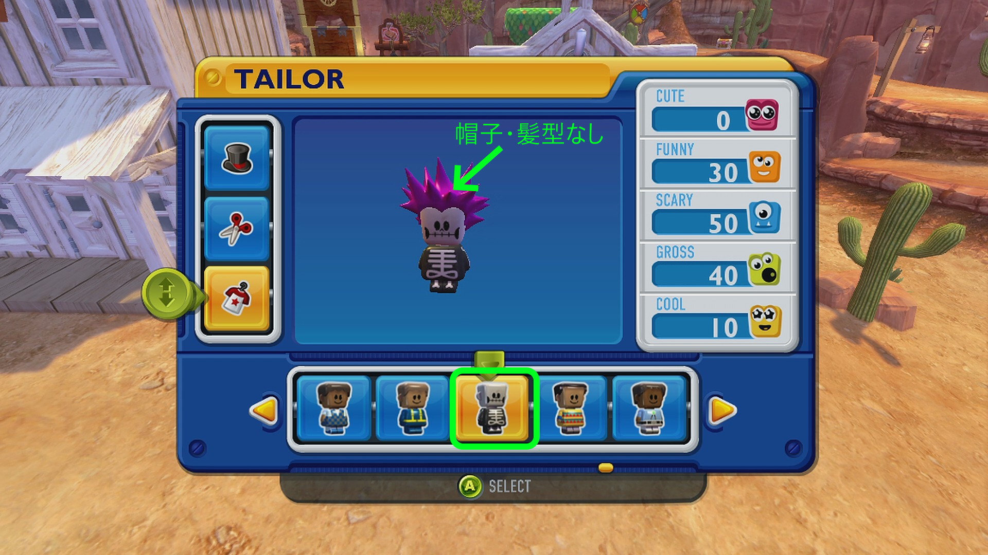 - 町民のひとりにスケルトンの服を着せる (帽子なし、髪型なしの状態にすること)