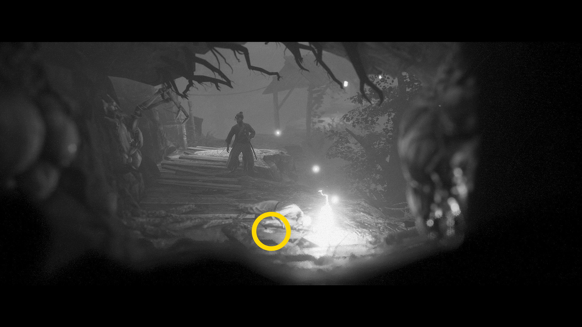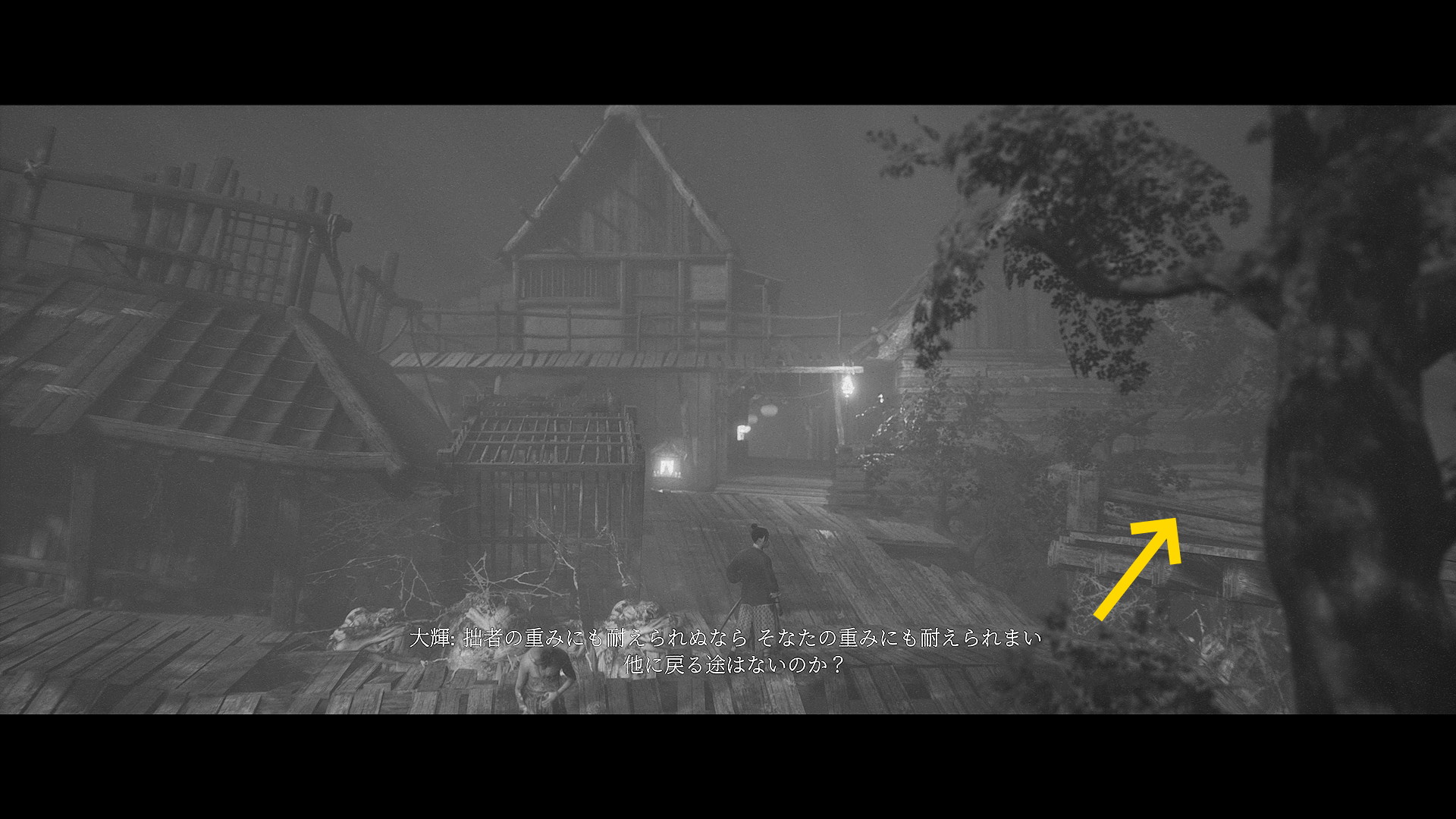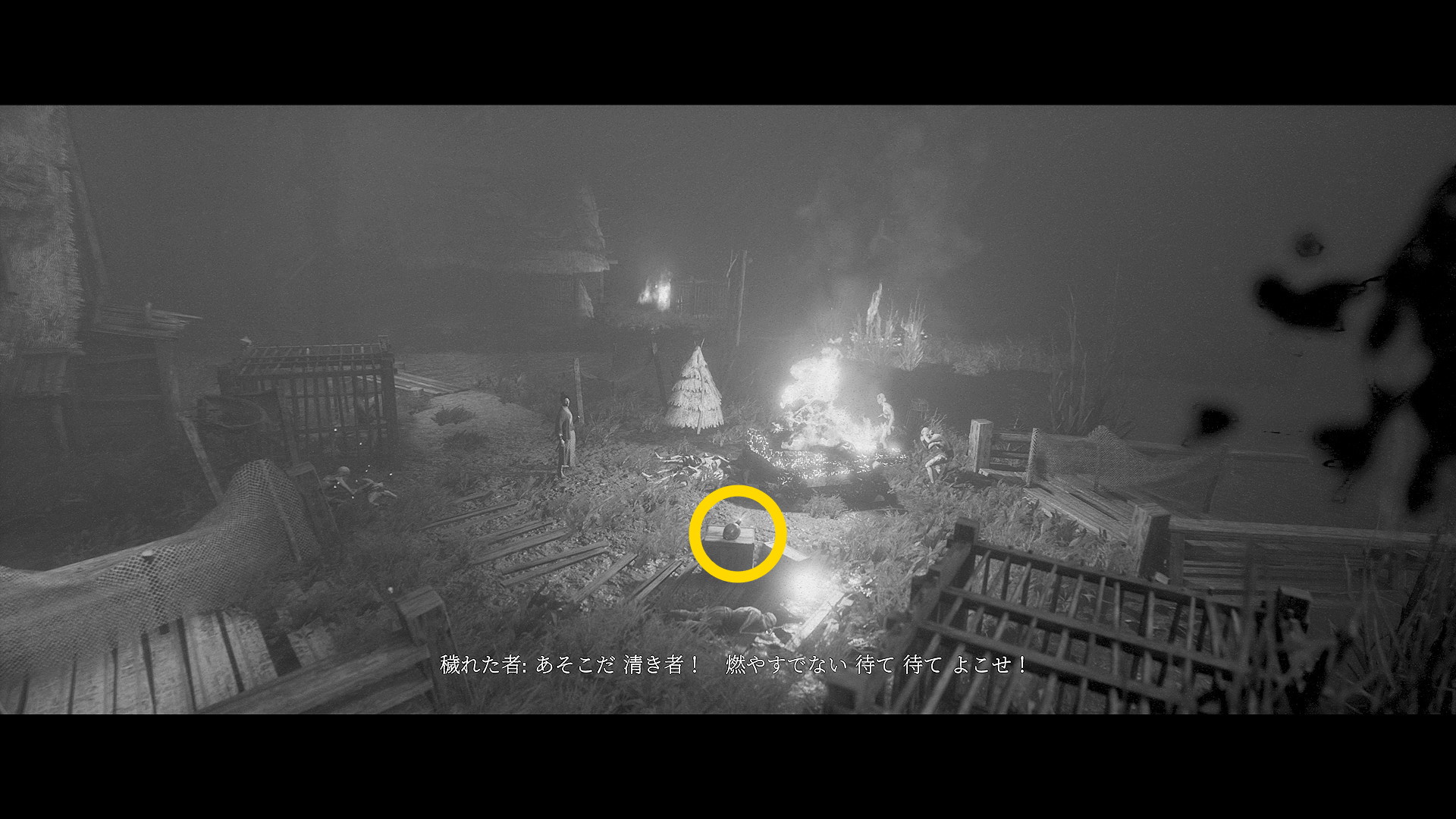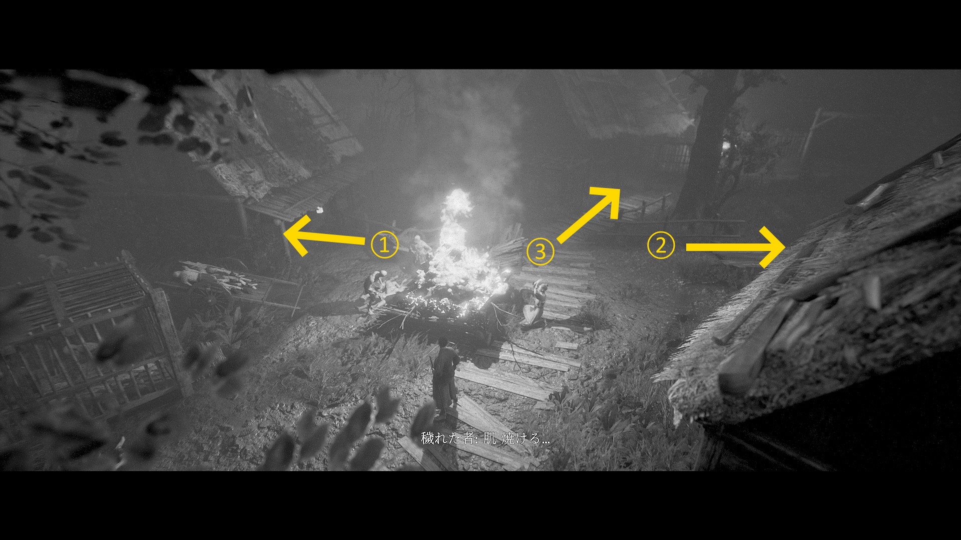 - 家にはまだ入らず、左に進んでいくと焚き火のそばの遺体のところに うわん