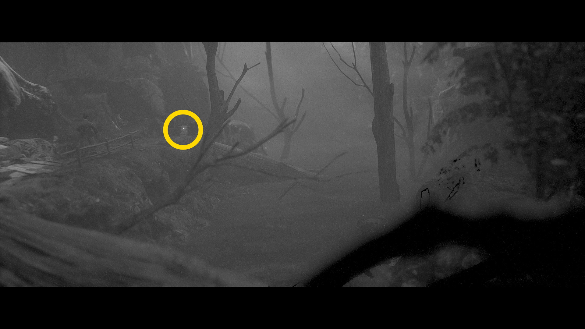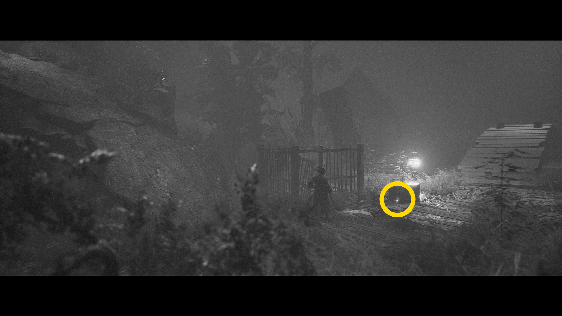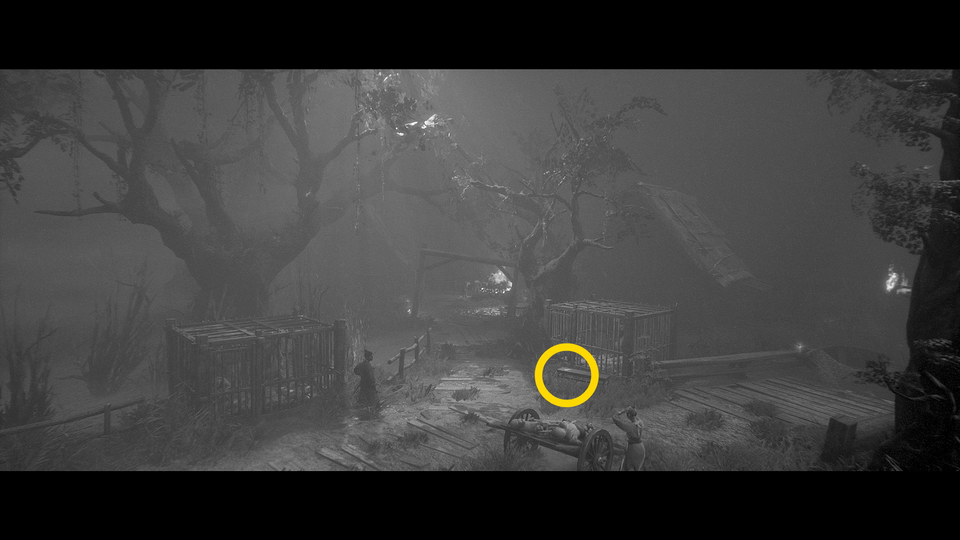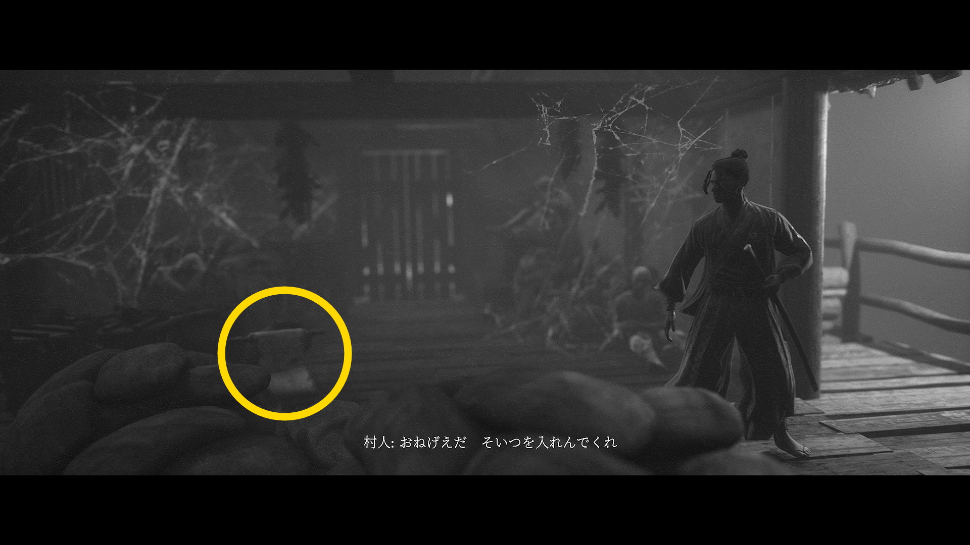 - 家にはまだ入らず、左に進んでいくと焚き火のそばの遺体のところに うわん