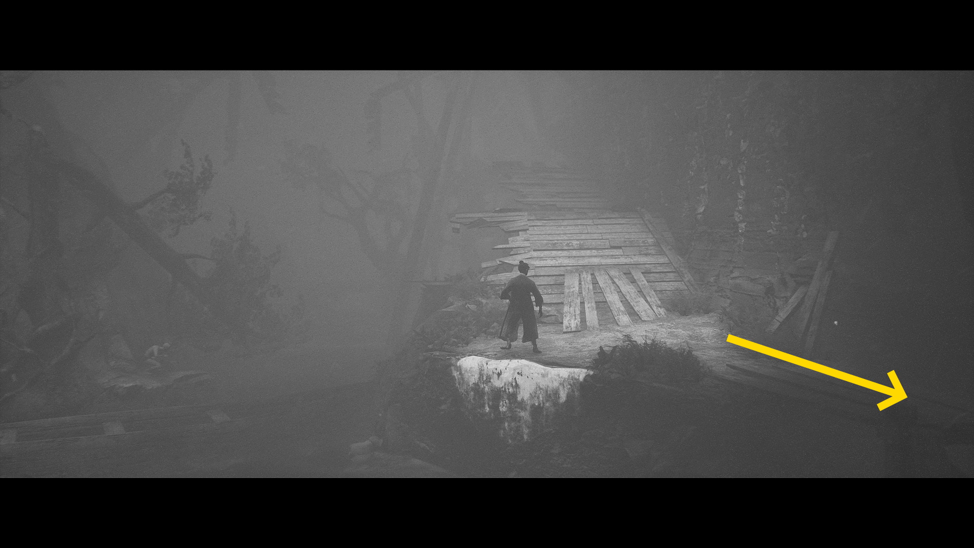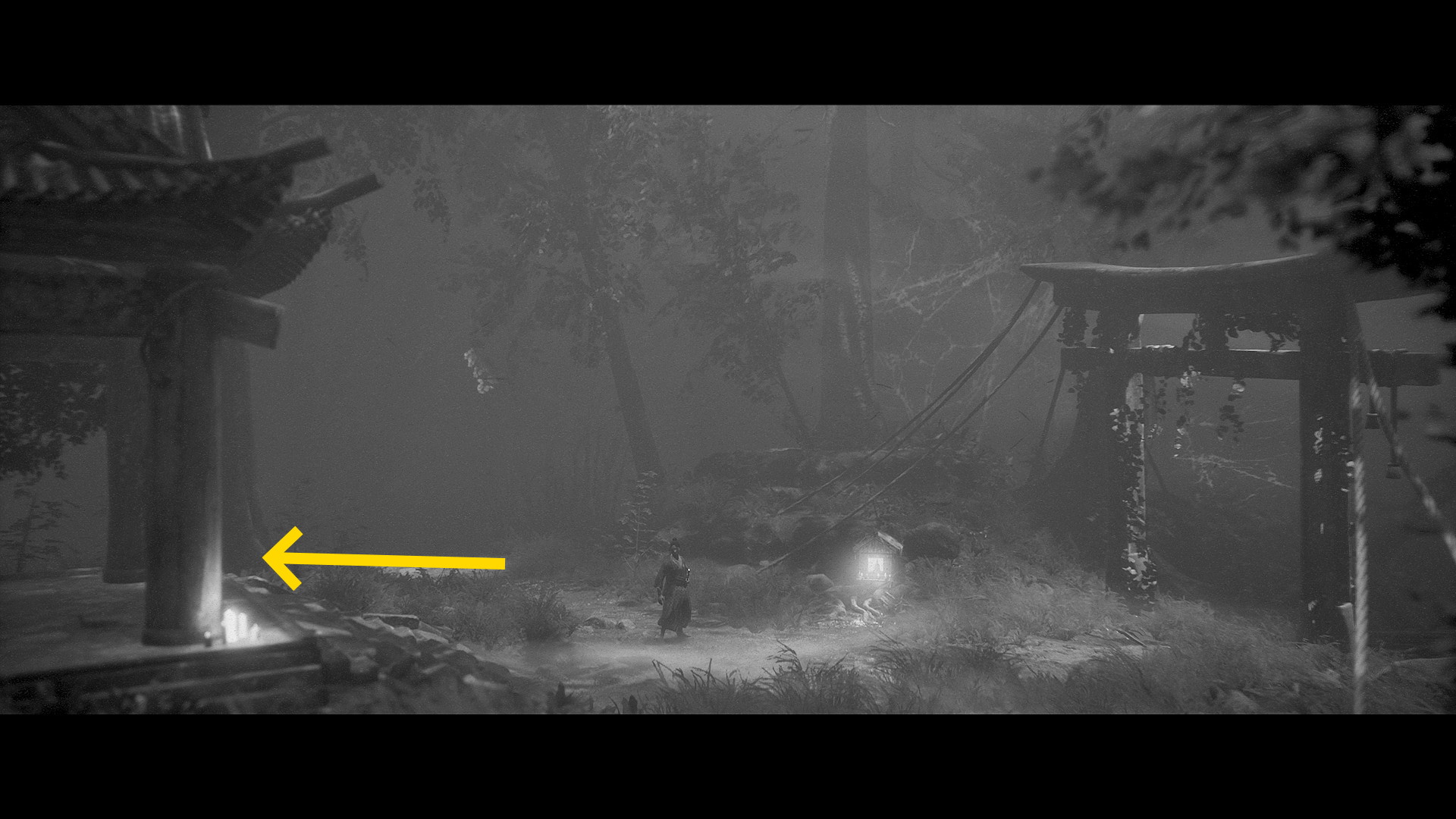 - 橋の崩落エリアをクリアすると画面奥に祠が見える