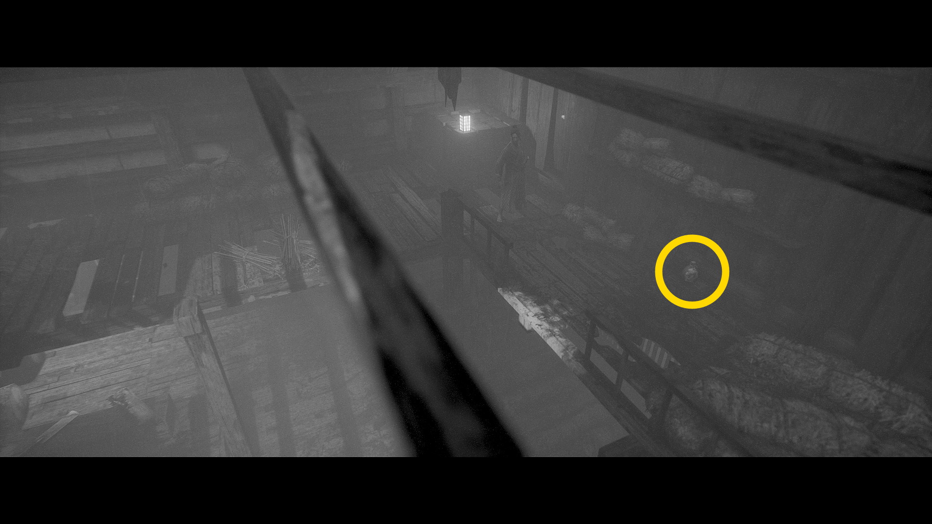 - 橋は進めないので、下の道を進んで大きな納屋に入る