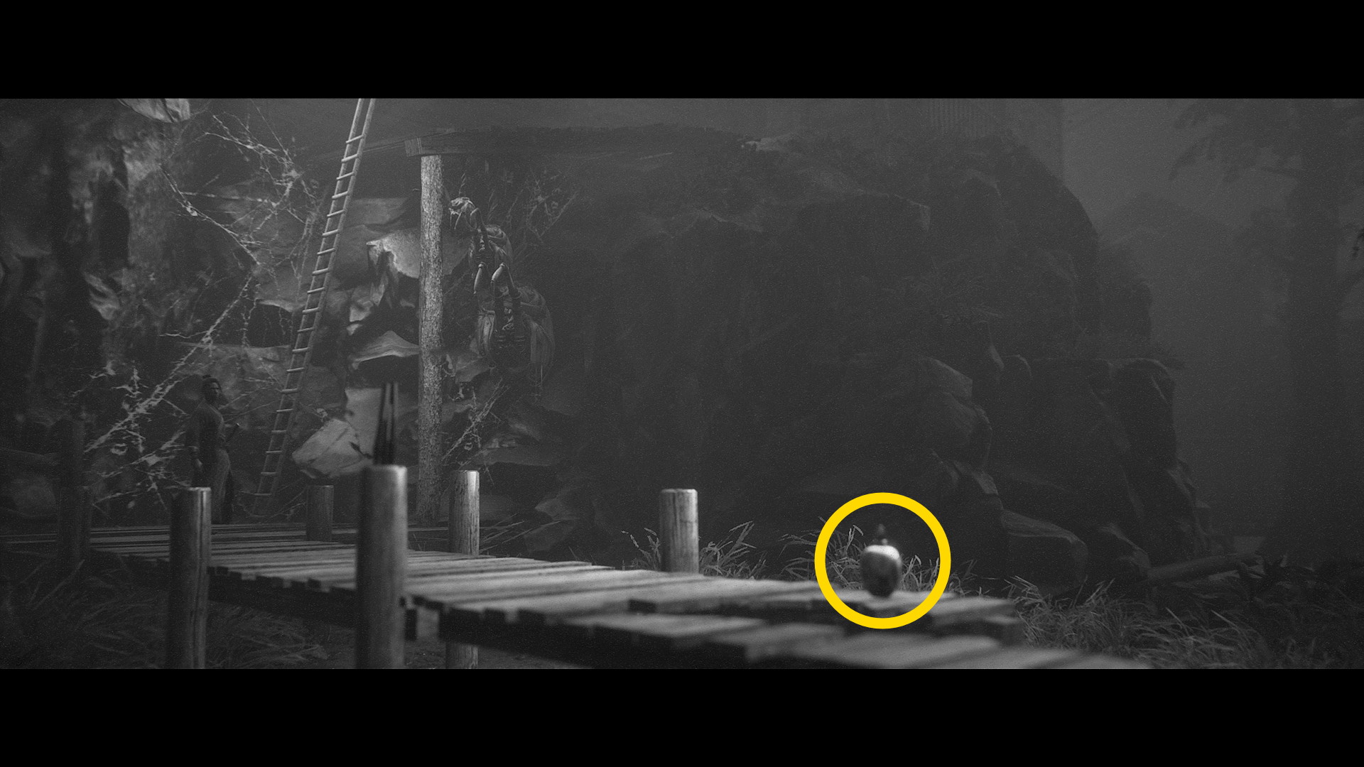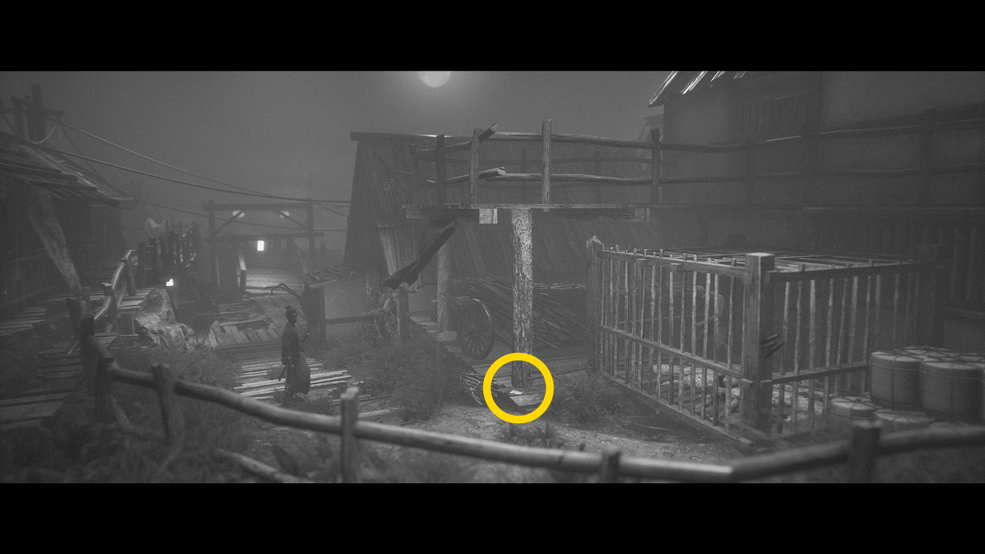 - 画面手前に進み、ハシゴを登ると丸太が積んであるところに 犬神