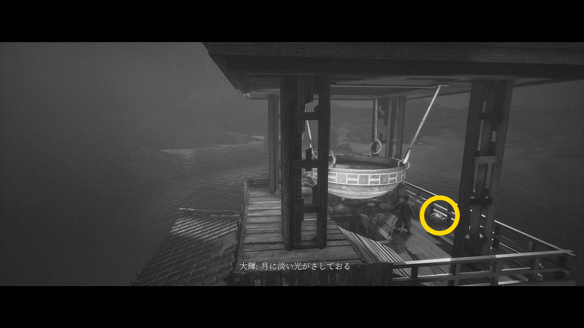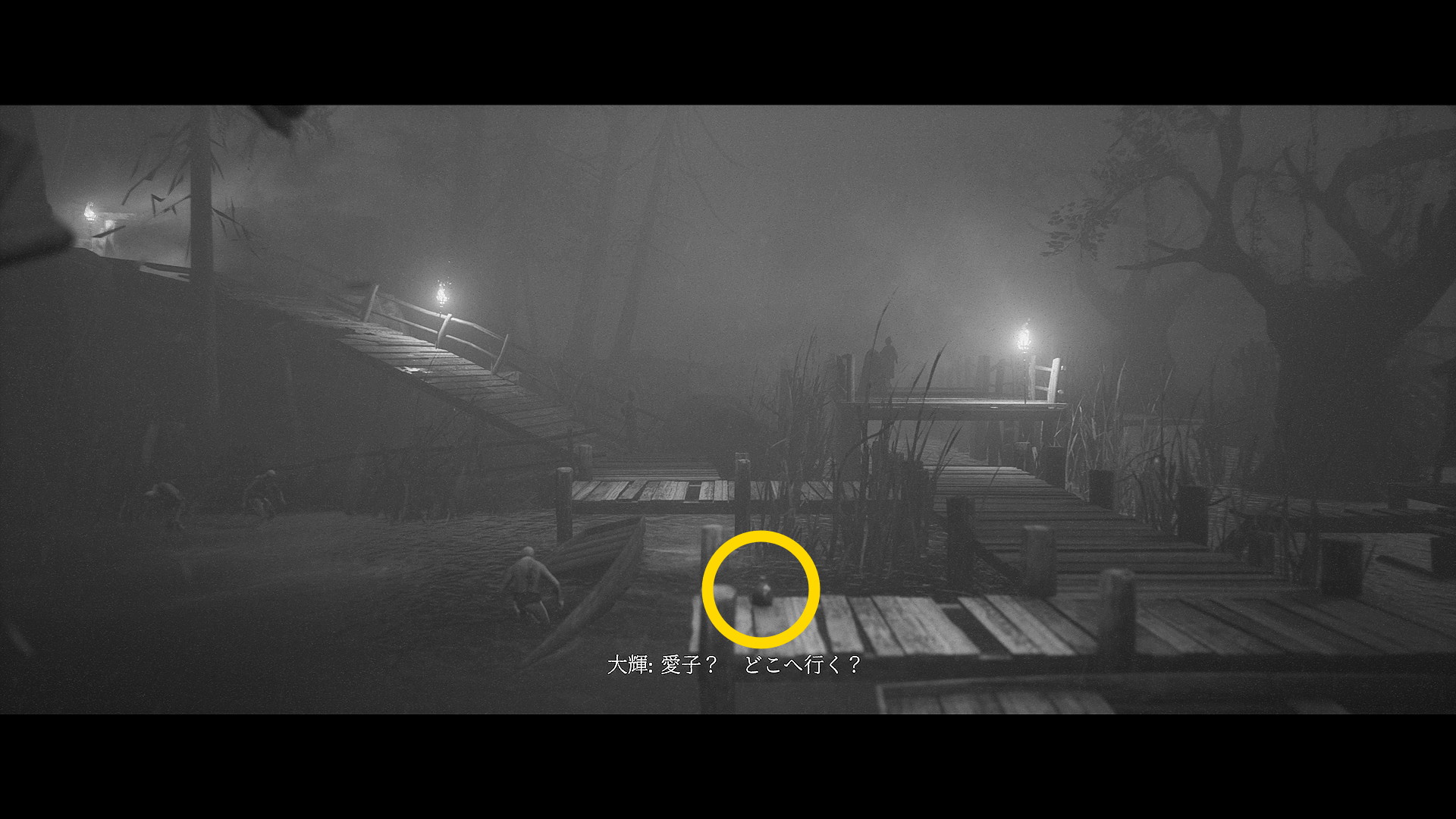 - 画面奥の筏に近づくとカットシーン