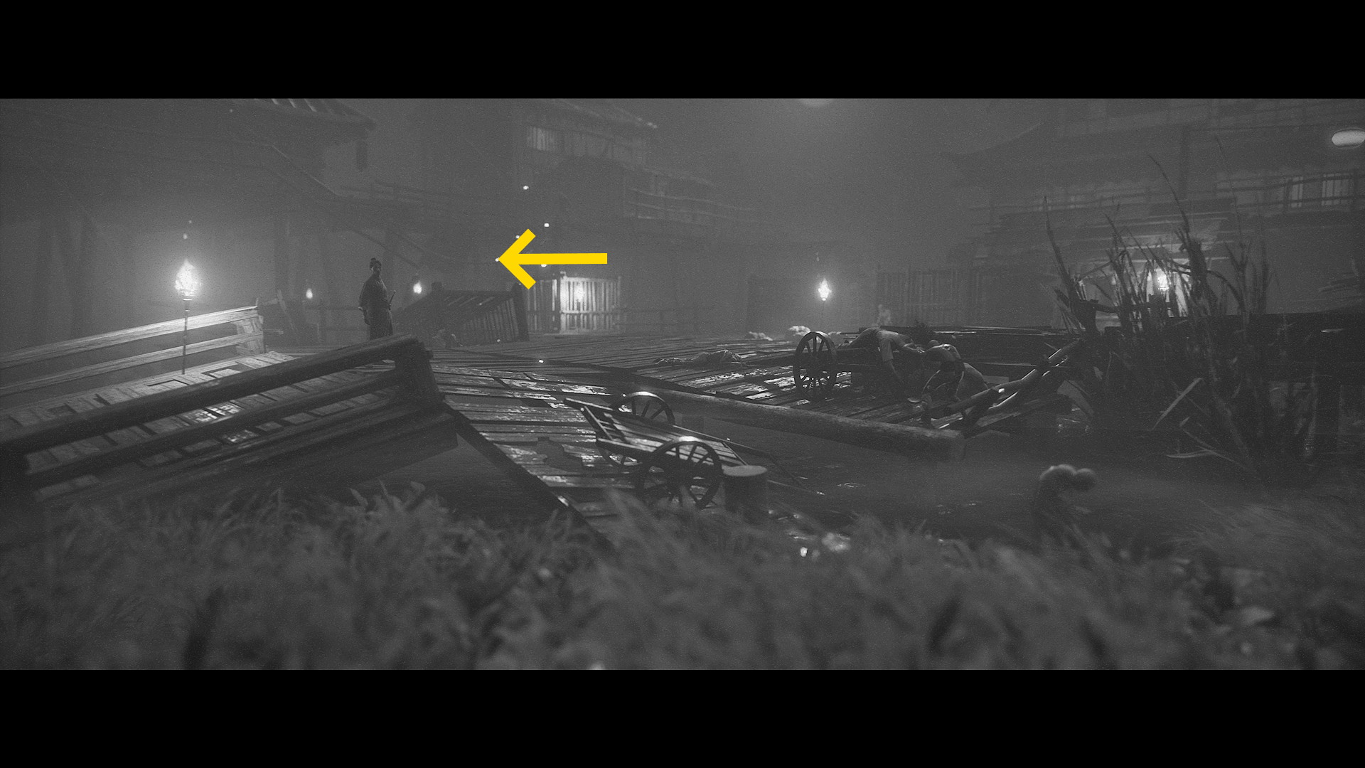 - さらに画面奥に進むと、屋根のある橋の上で射手1体、旗持ち2体と戦闘
