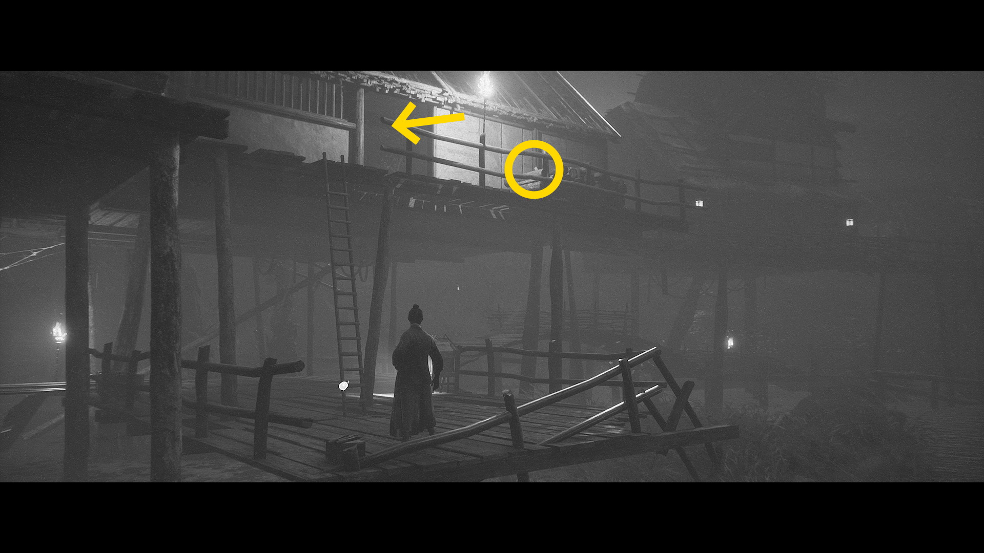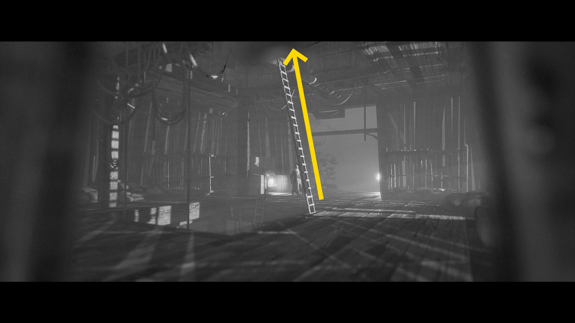 - ハシゴを登って上層に着いたら、画面手前に見えるハシゴを登って最上階へ