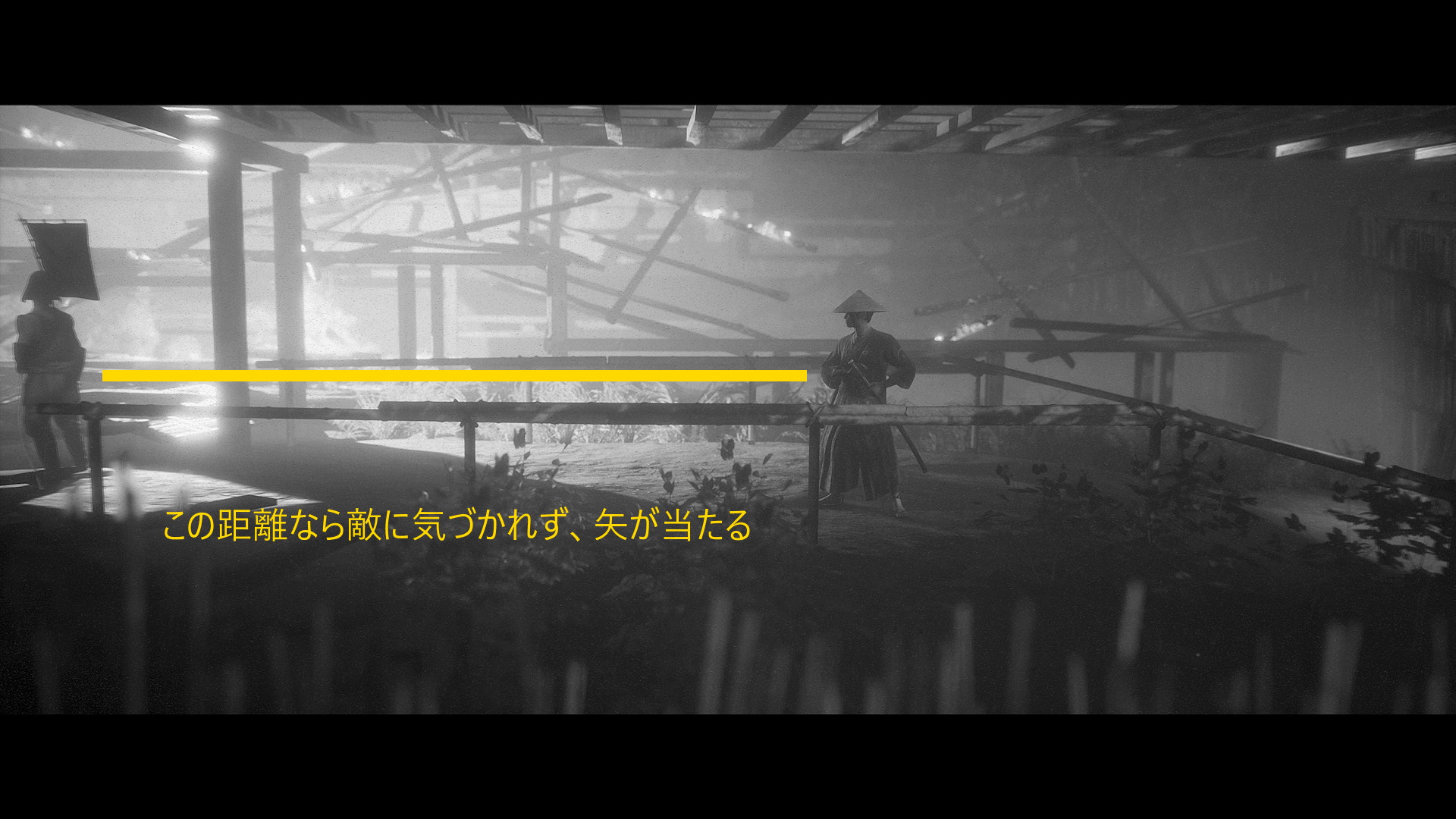 - よしずの壁に火矢が降り注ぐエリア。敵が大輝に気づいていなければ弓矢1発。射手はこちらに気づいていても弓矢2発で始末できる