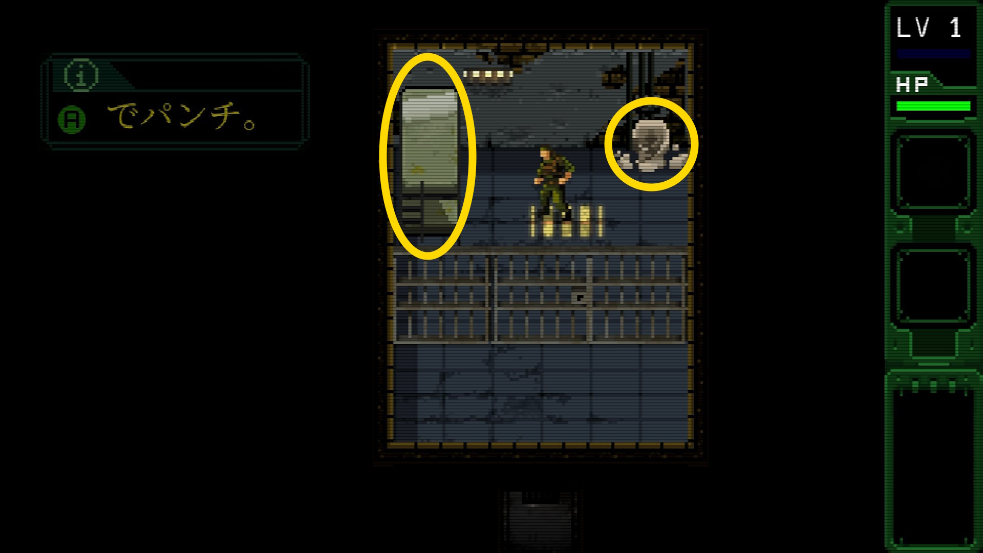 - マップ中央の緑箱を壊すと 劣化ウランボール を入手(あとで作製することになるスリングショットで使う弾。このアイテムは何度も出てくるので初出だけ記載)