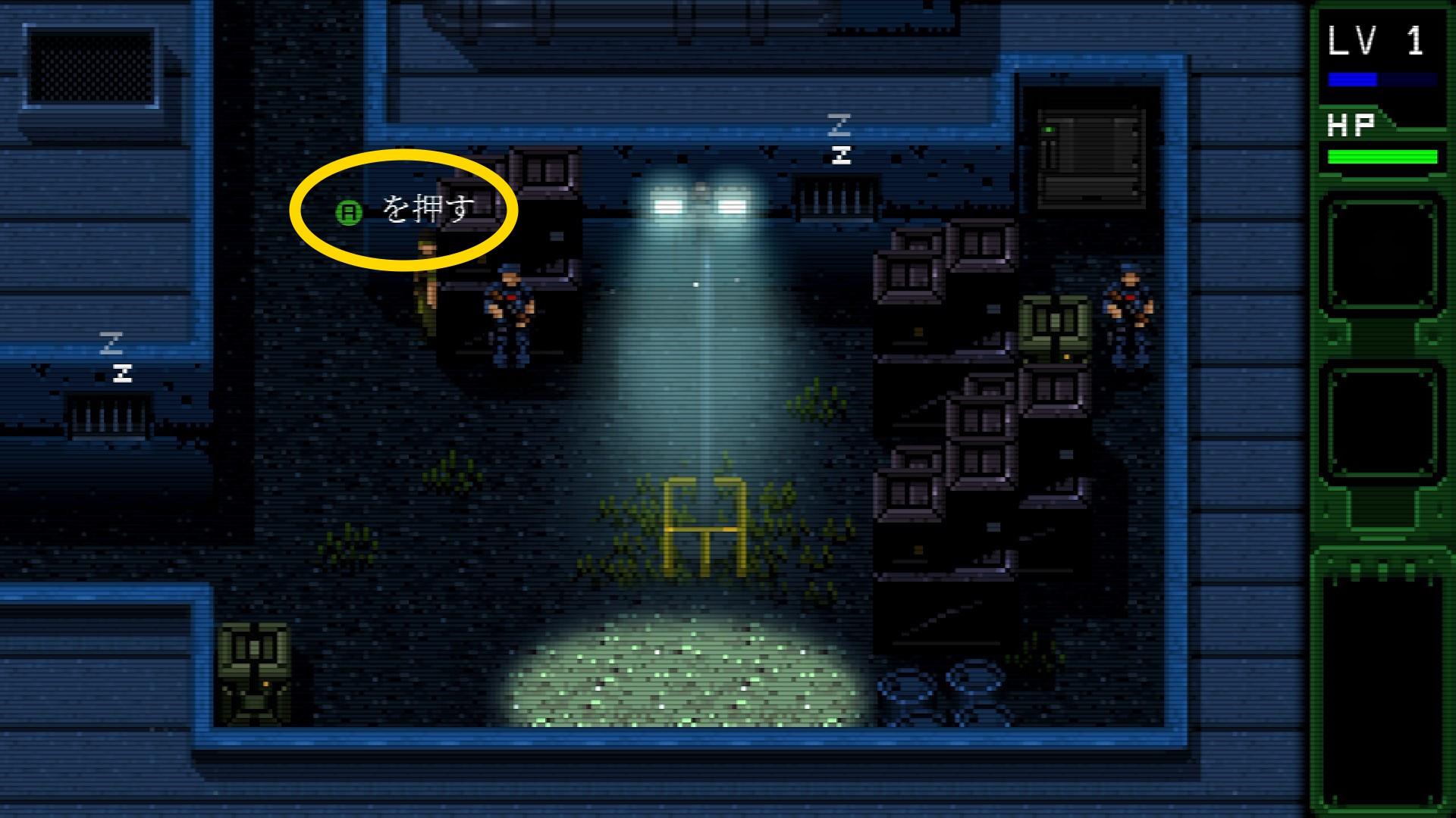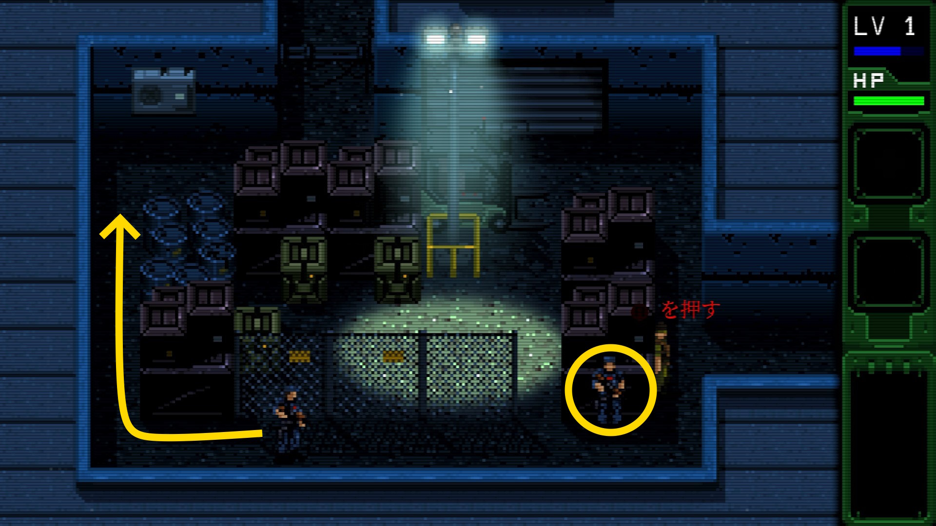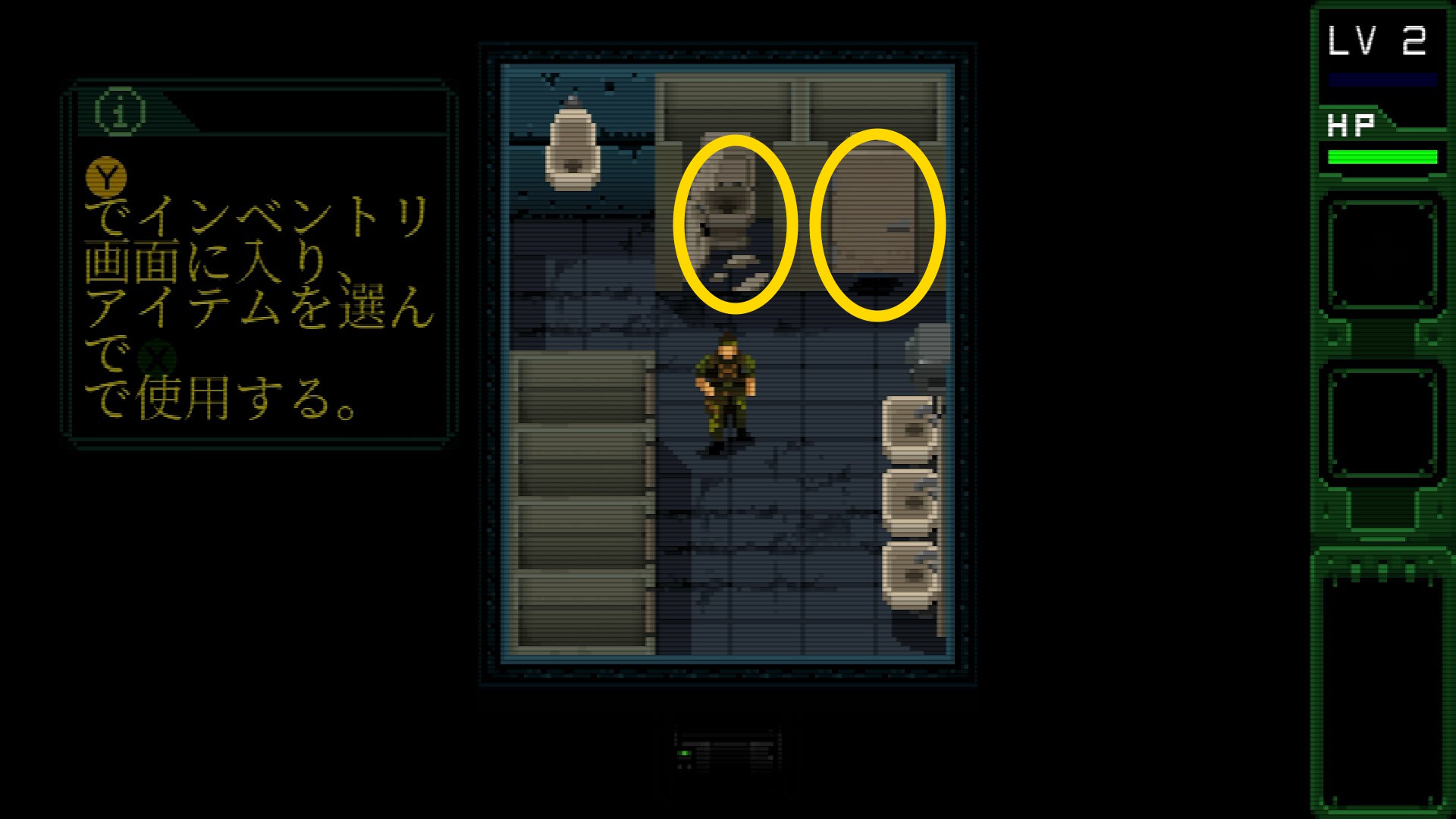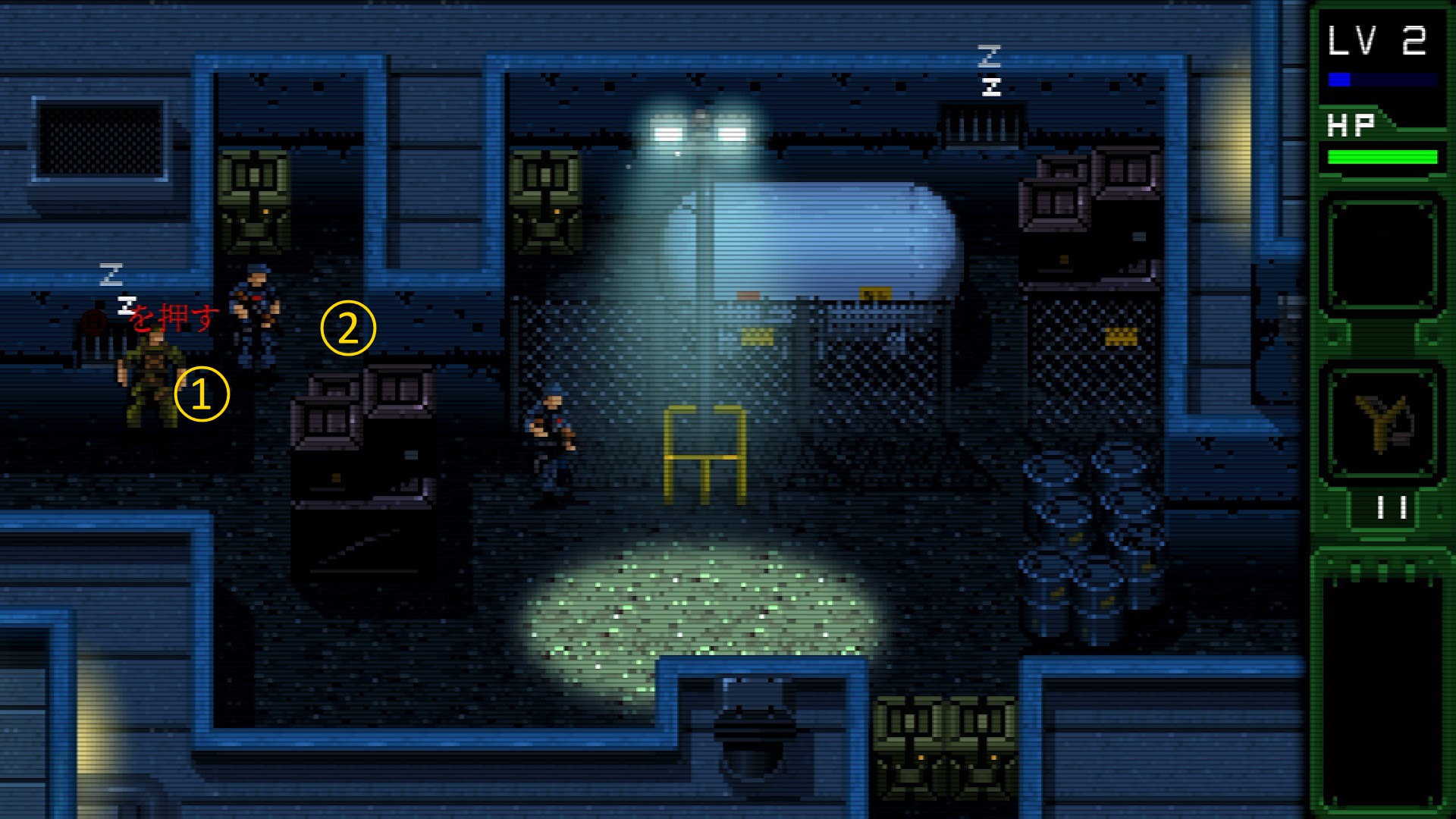- ハリス大佐との会話を終え、下に移動したあと左に進む。なお、画面が切り替わる前に倒した敵を A 2回押すことで運ぶことができる説明あり