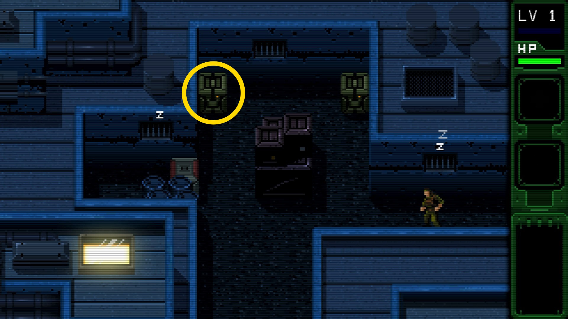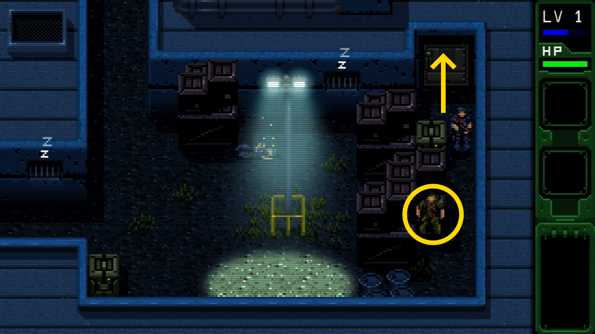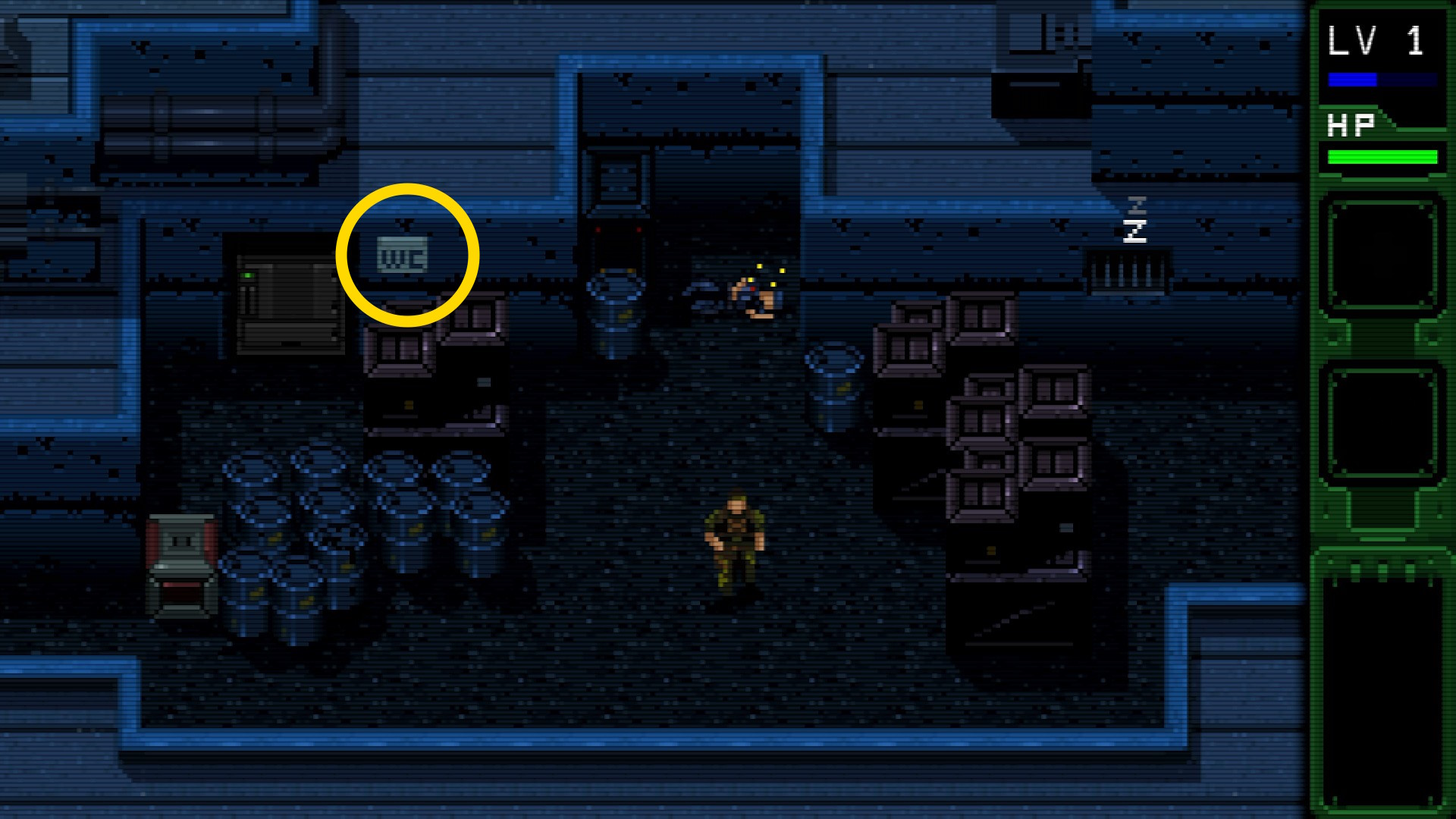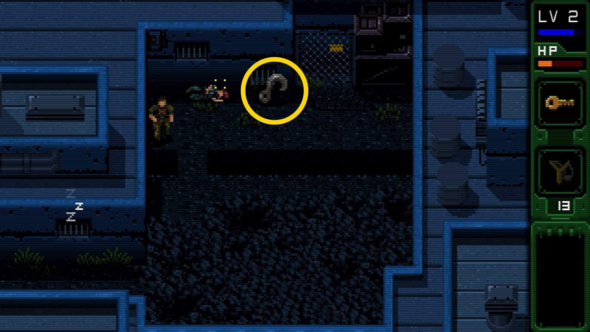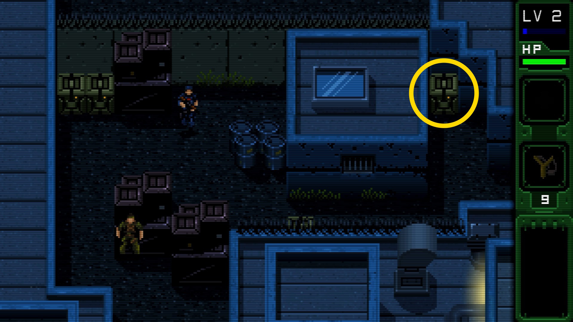 - ハリス大佐との会話を終え、下に移動したあと左に進む。なお、画面が切り替わる前に倒した敵を A 2回押すことで運ぶことができる説明あり