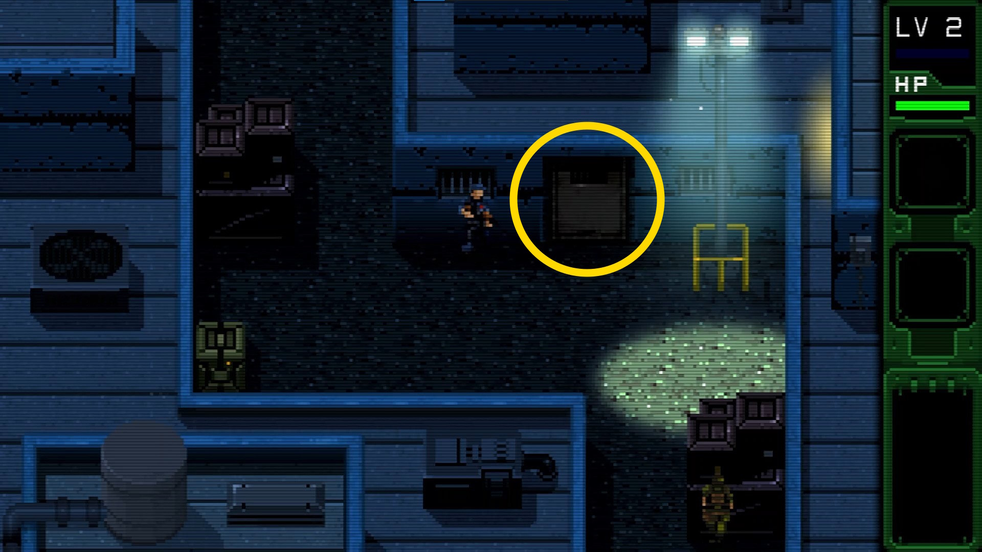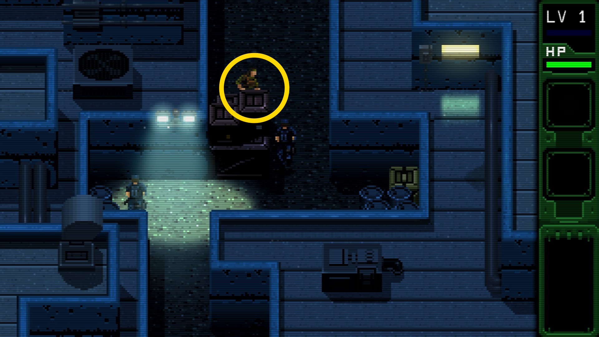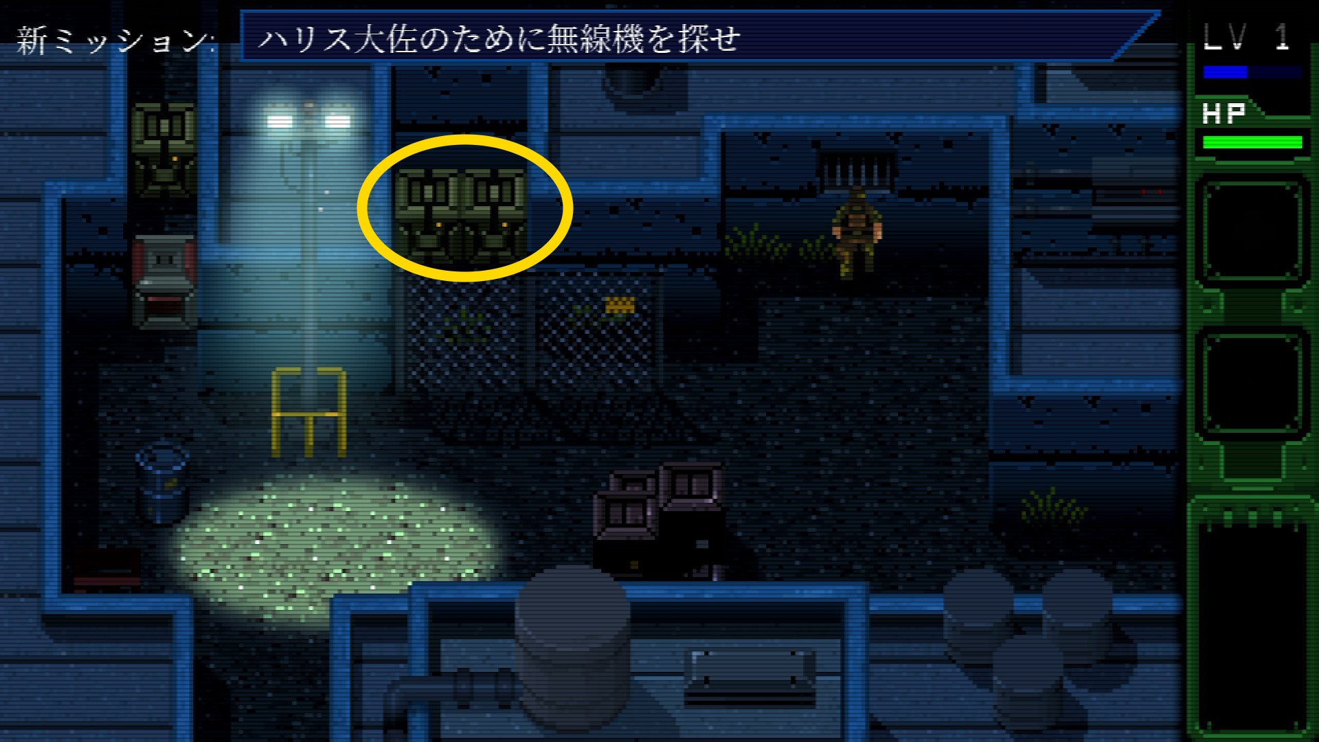 - 手前の敵は2回調べるとことができ、暗号化されていない無線機 を入手できる ⇒ 回路基板と合成して 暗号化された無線機 を作る ⇒ LT で通信画面を開き、LINE 01 を選ぶことでハリス大佐と通信できる