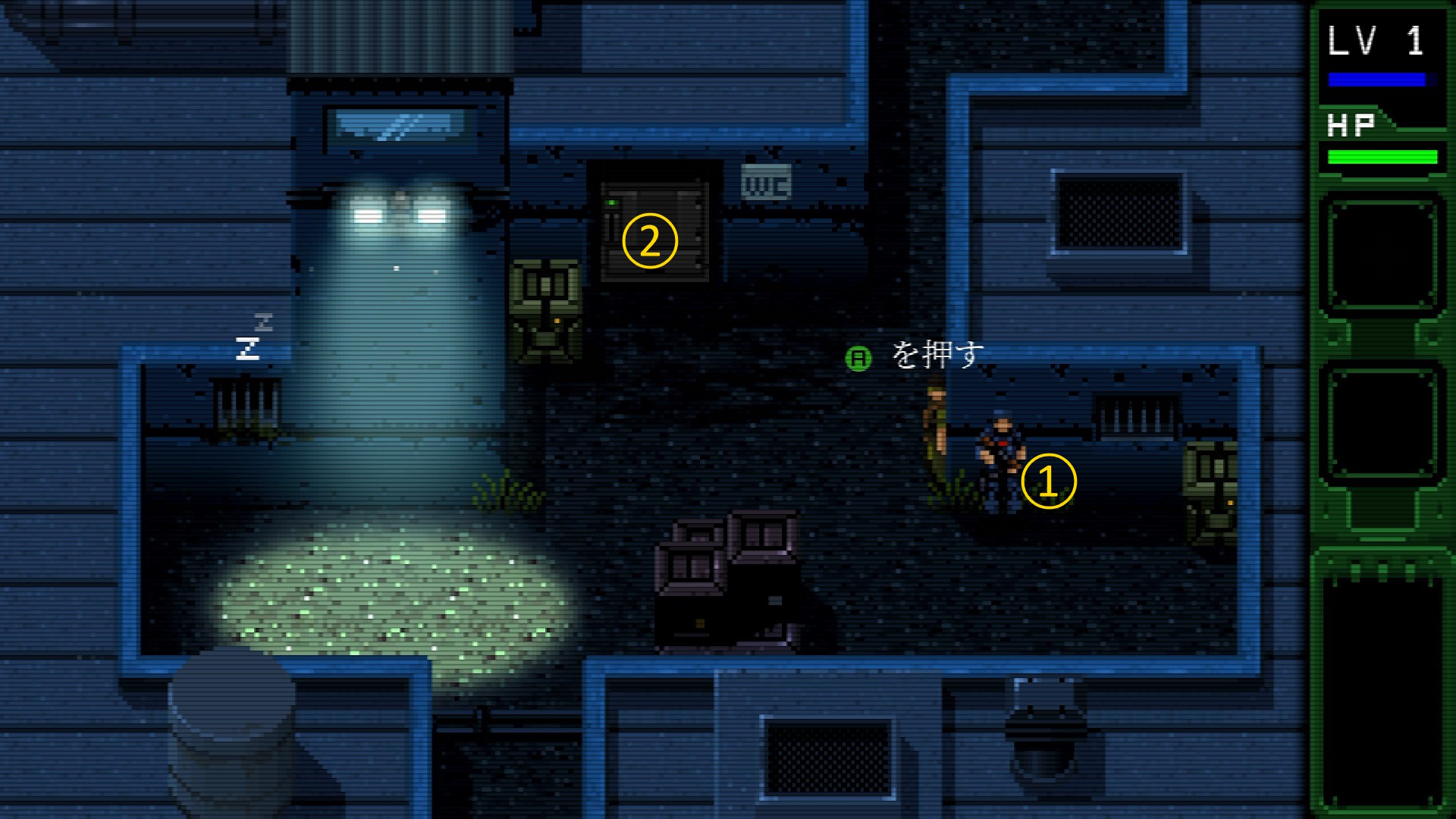 - もし、ガスタンクのところにいない場合(つまり下画像のところ)にいる場合は、下画像①で1人目を倒し、すぐに②のところへ行ってから、やってきた2人目を倒すとノーアラート