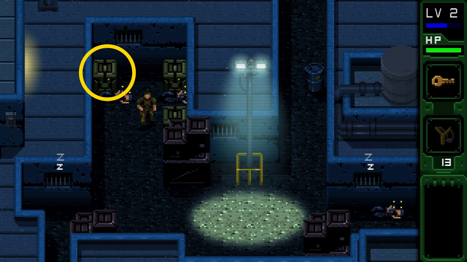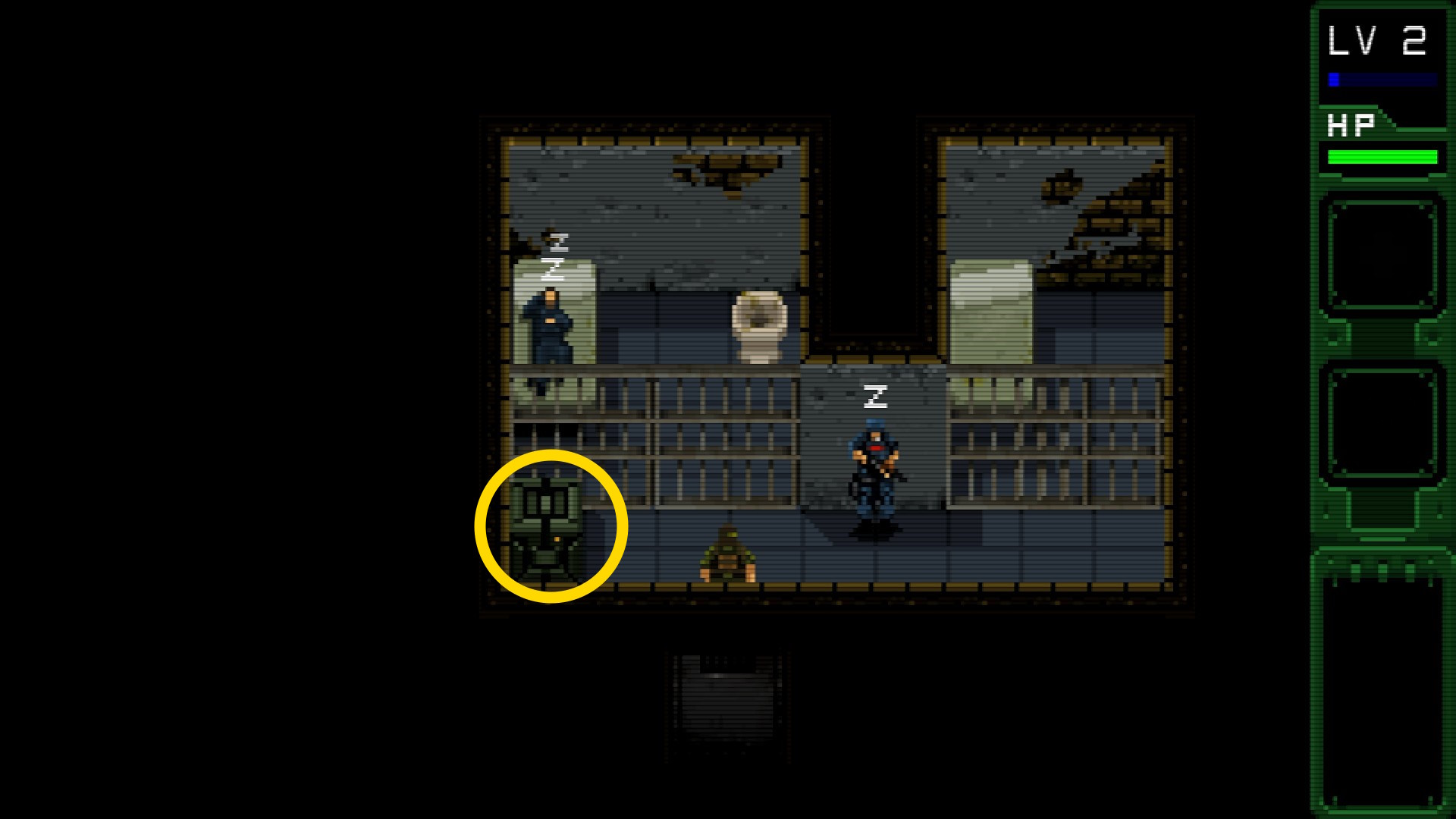 - 画面が切り替わると2人の敵がいる。内1人は巡回しているので、こいつが左上の方に戻るまで手前の敵を倒してはいけない