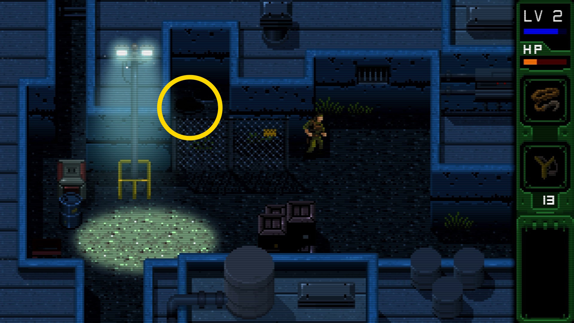 - 画面中央付近にいる敵は位置がランダムで2箇所あり、下画像のところとガスタンクのところにいる場合がある