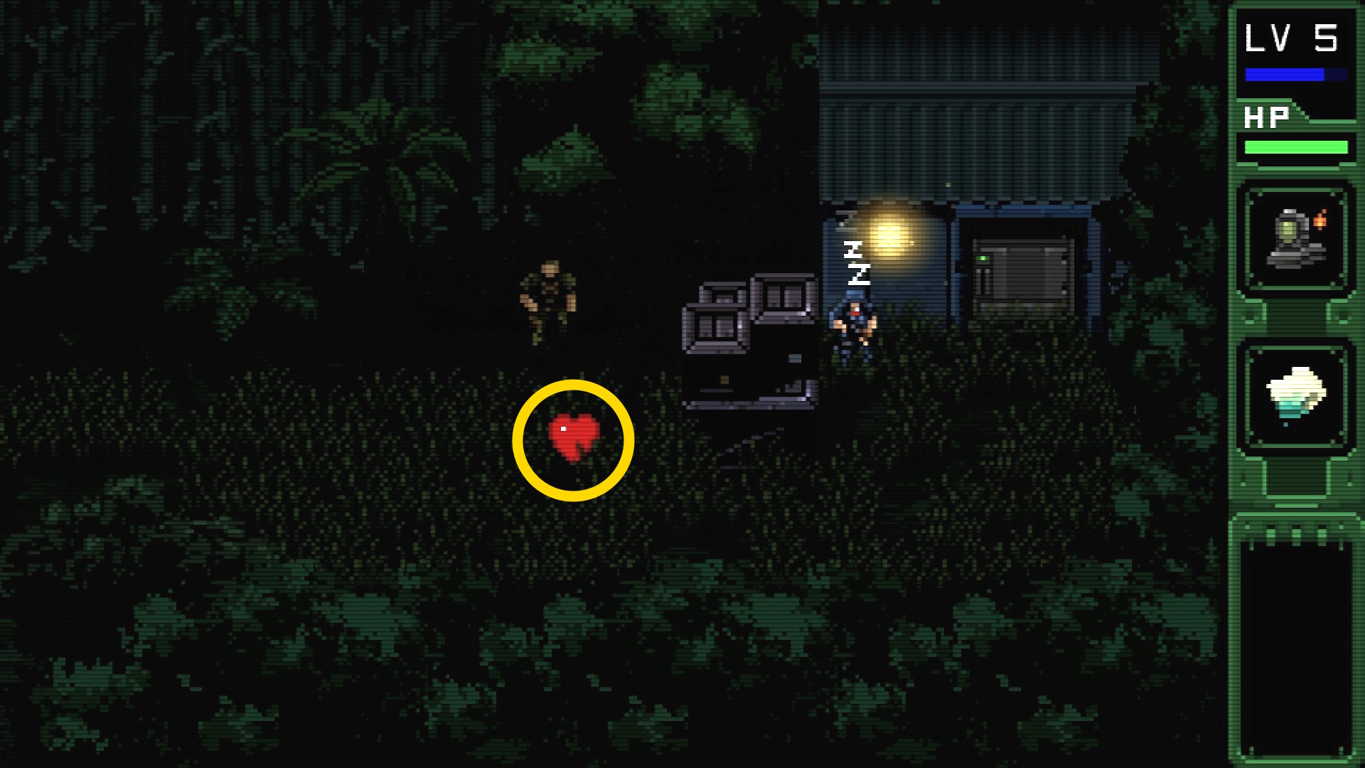 - 右に進むと敵が1人おり、ちょっとした会話シーン。その後、敵は立ったまま寝る