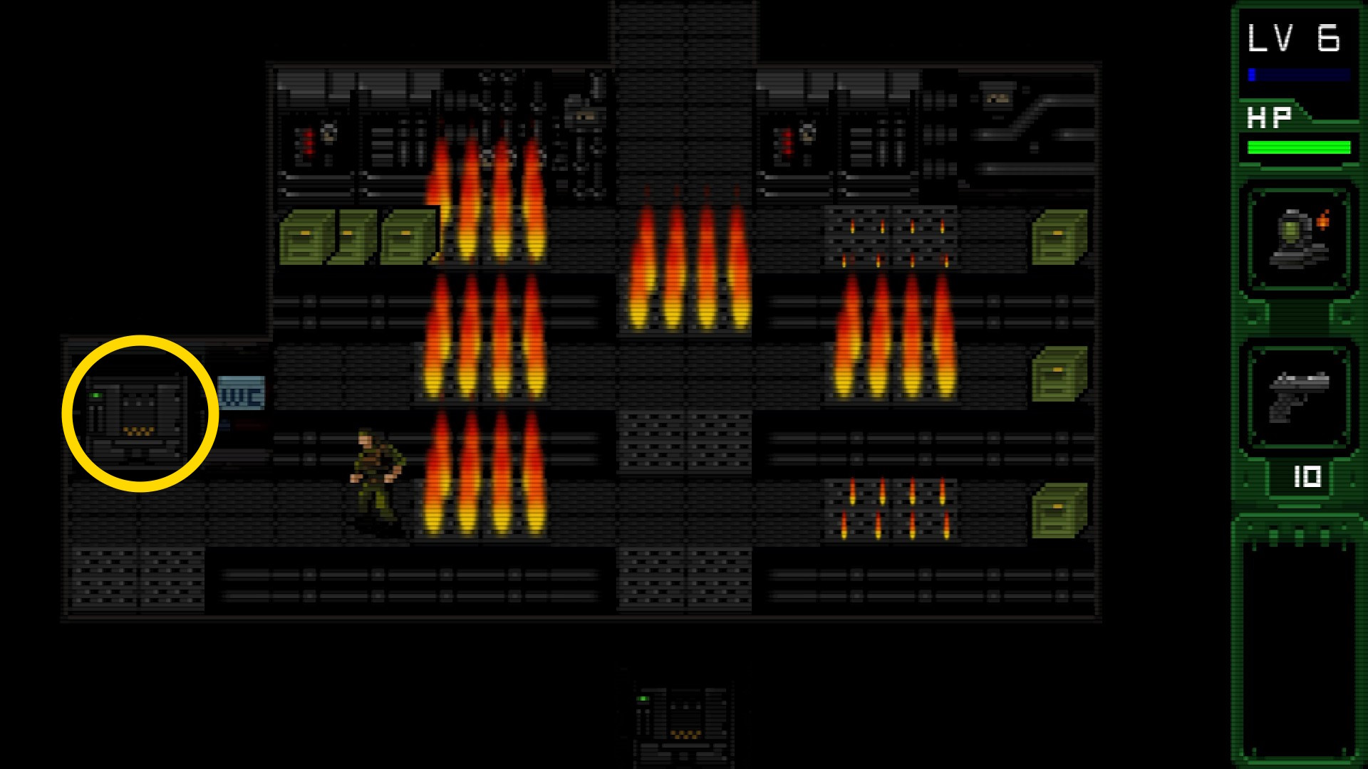 - 左にトイレ、炎の左右に緑箱があるが、あとで立ち寄る