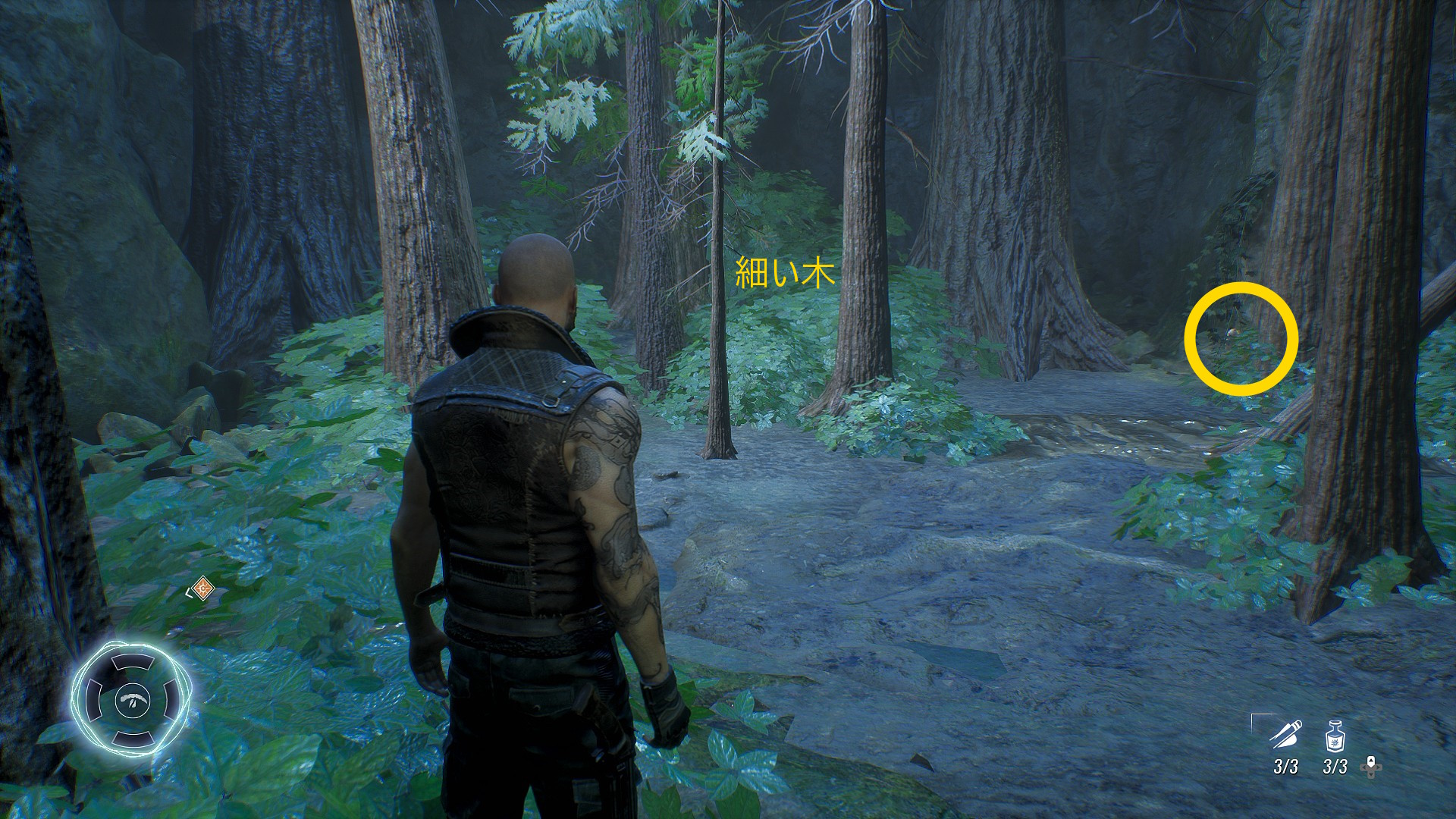- 左を向き、坂を下ると細い木が見える