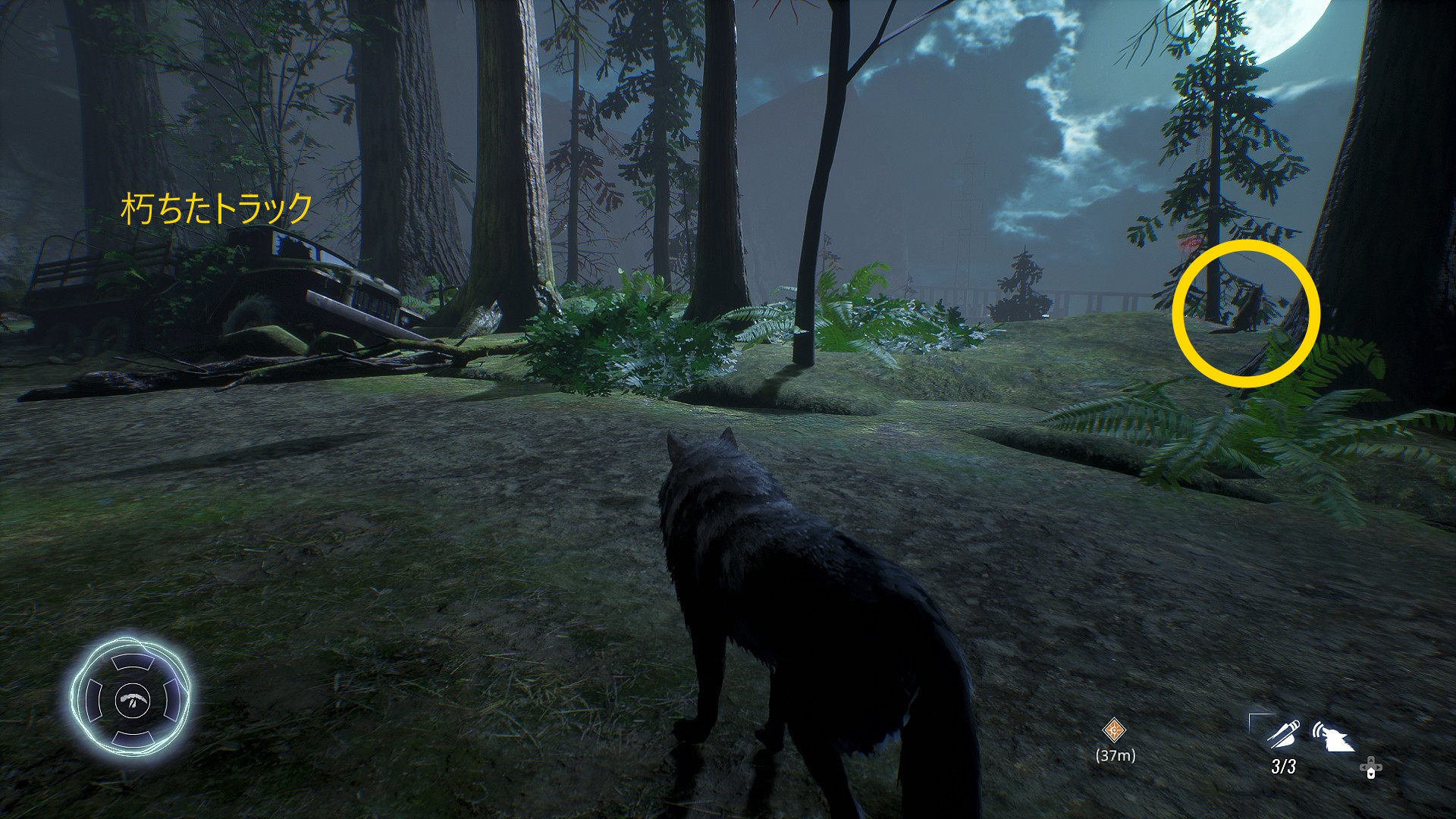 - 道に戻ったら、奥に進んでいくと前方に朽ちたトラックが見えてくる
