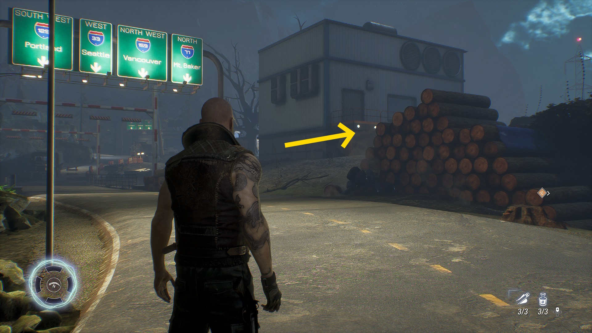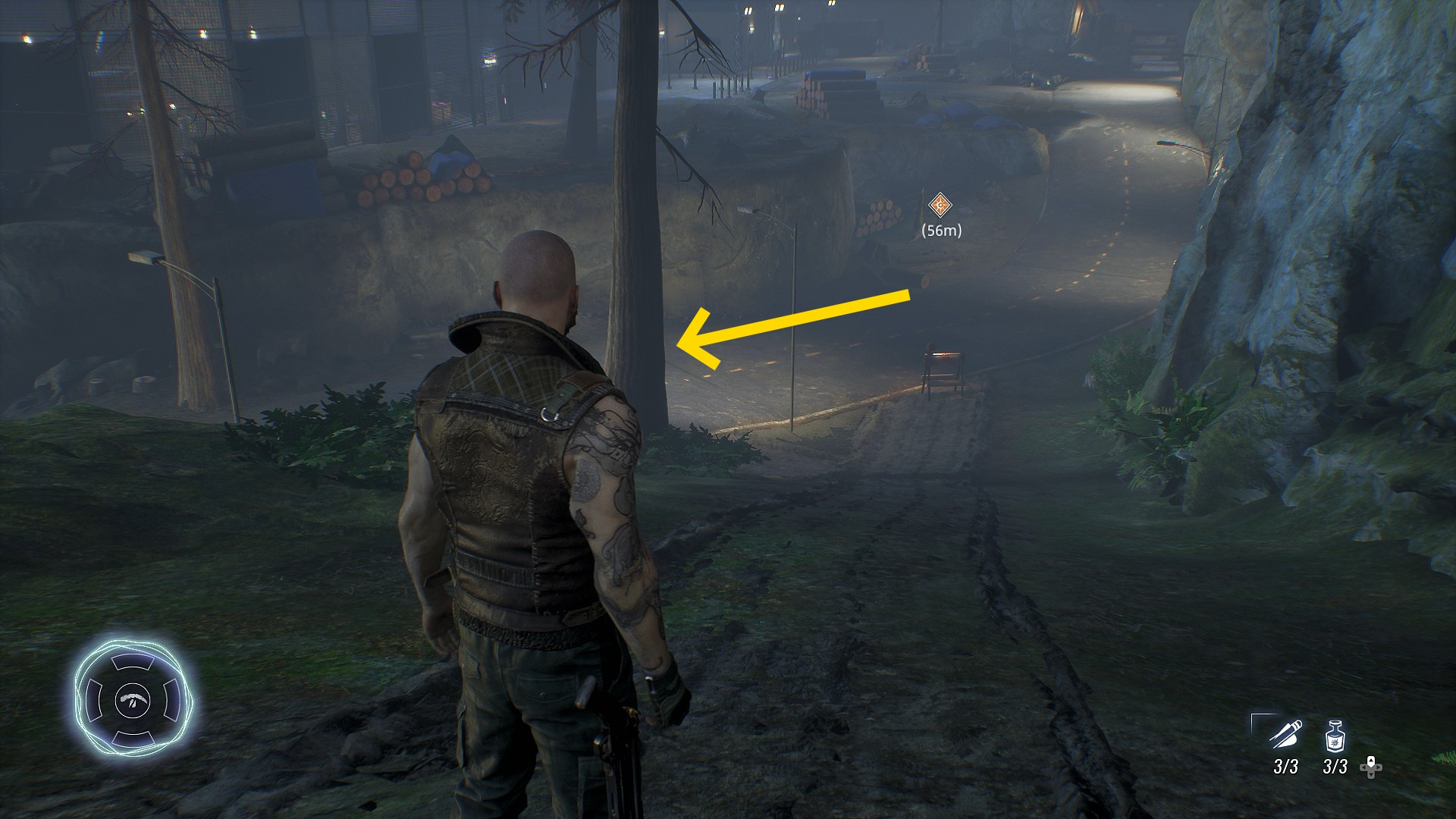 - すぐ右側に積まれた木があり、そこを右に入っていく