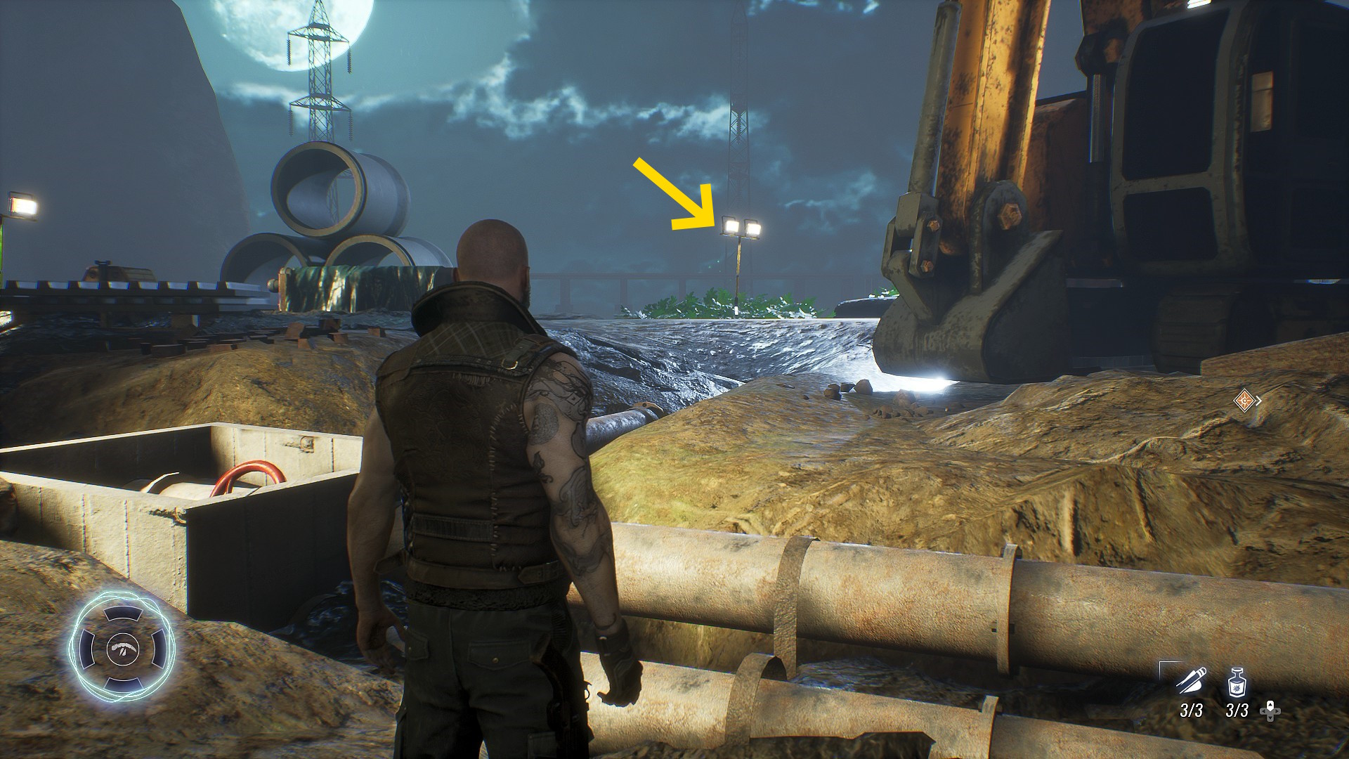 - 右側にショベルカーが停まっており、その奥に投光器がある