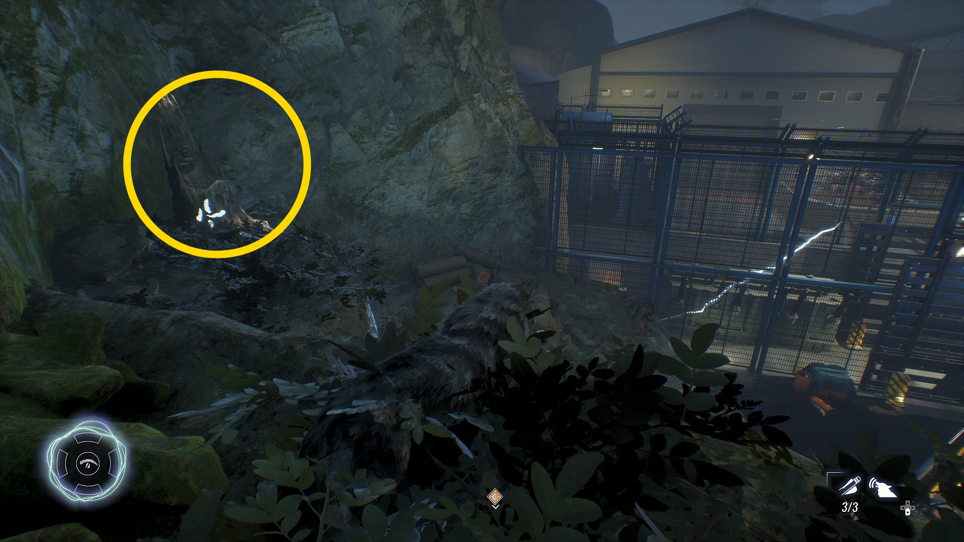 - 切り株の向こうにエンドロンの施設が見える(フェンスが電気ビリビリ)
