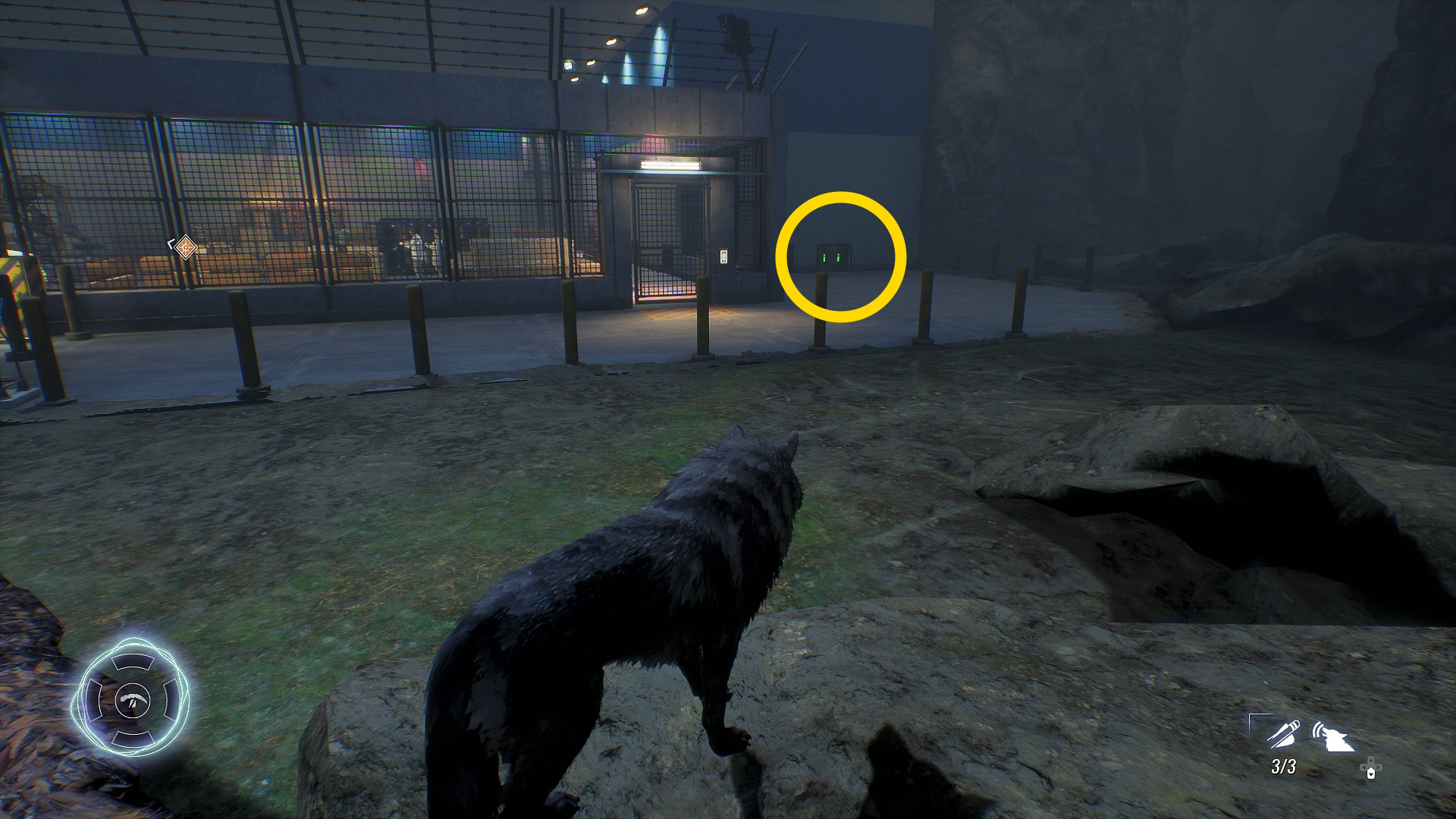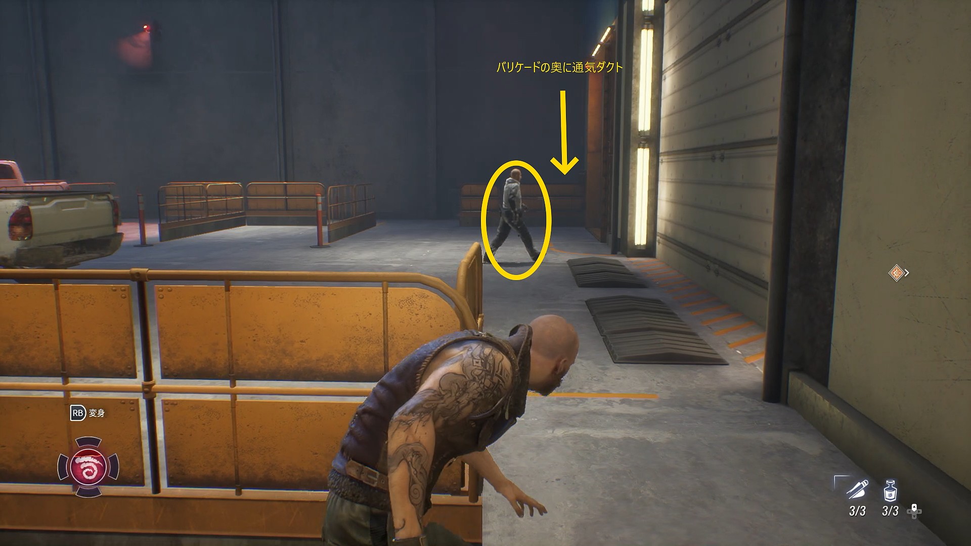 - 残った1体に近づいて暗殺し、そのまま奥のバリケードを越えて通気ダクトに入る(倒した敵を仲間が見つけて警戒状態になるが、カハルの姿を見つけていなければ増援は呼ばれない)